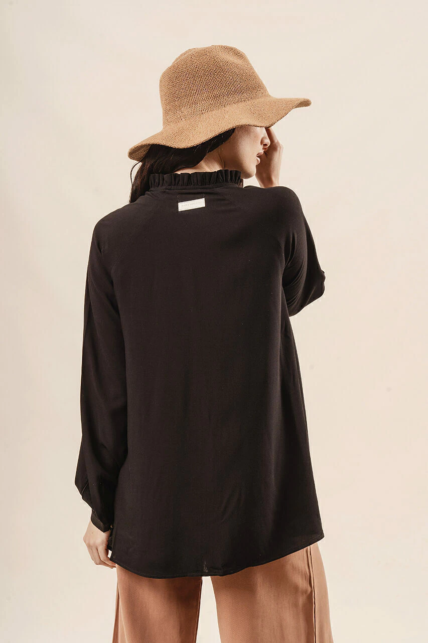 La blusa Algaria es ideal para usar en cualquier momento. Fresca, amplia y de áspecto relajado, con detalle de fruncido en el cuello y tiras para moño.