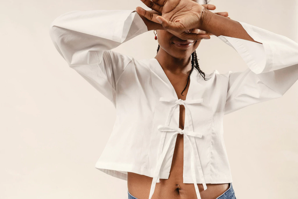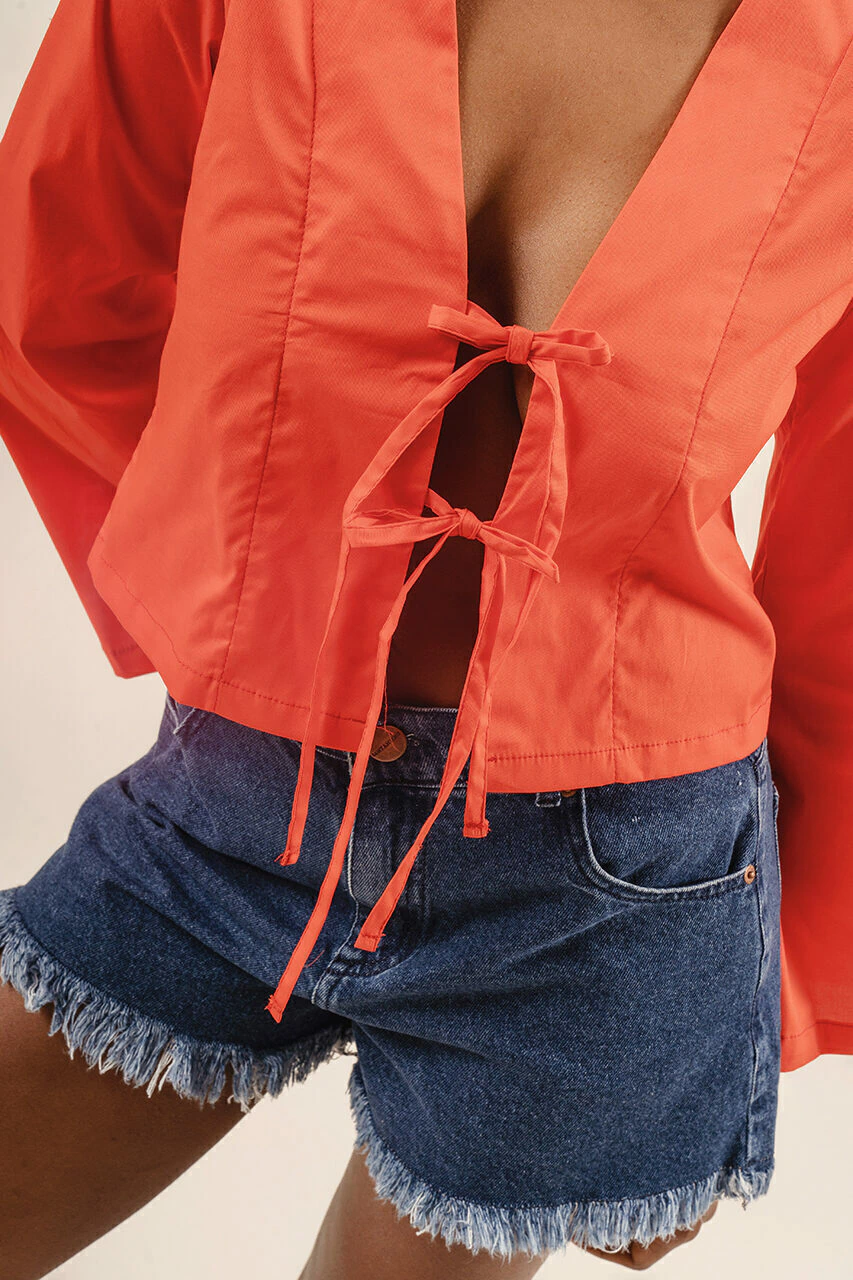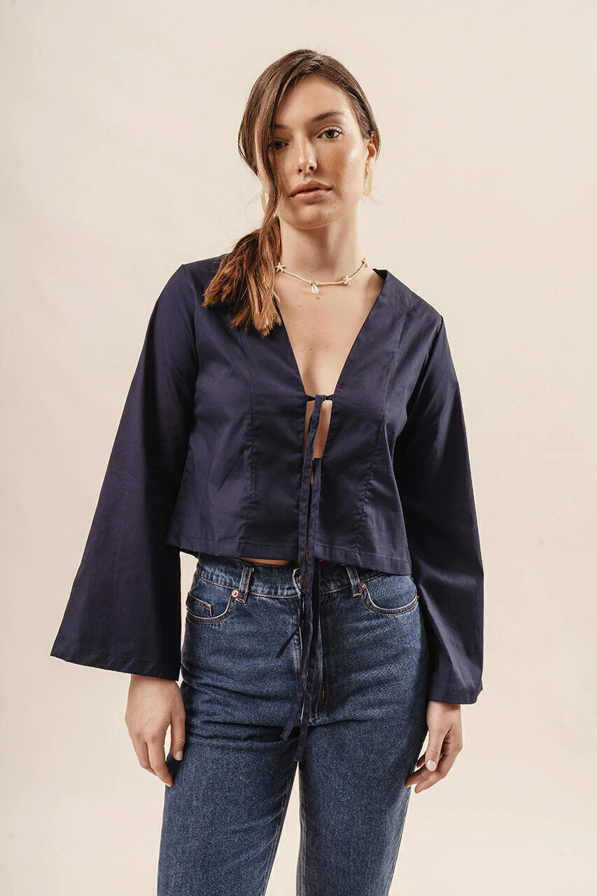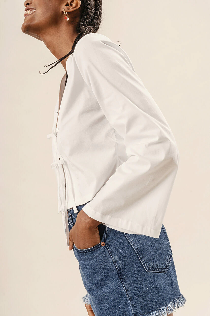 La blusa Aragonita es una buena opcion para vestir fresca, moderna y minimalista. Realizada en tela Poplin, logra una silueta con cuerpo mientras que las tiras en delantero (moños) dan un toque relajado.