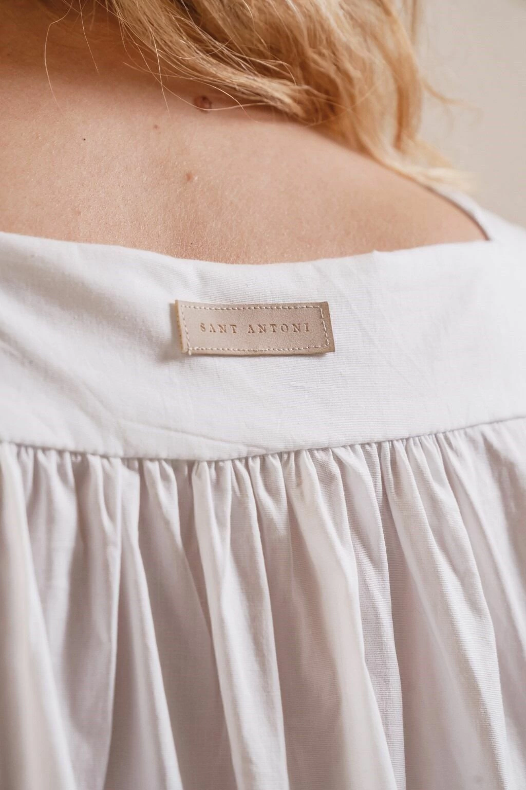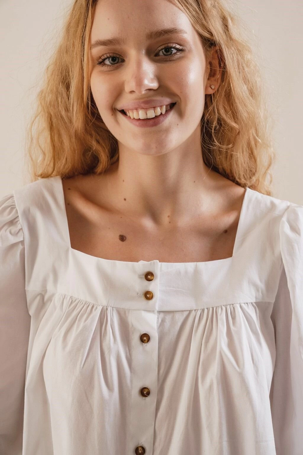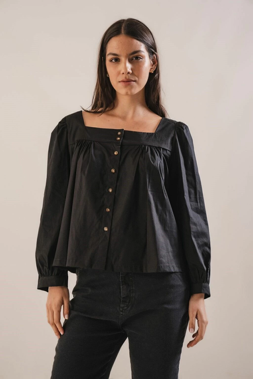 La camisa agapanto: cuello cuadrado, mangas semi bombe y abotonada al frente, ofrece una silueta suelta con detalles de pliegues.