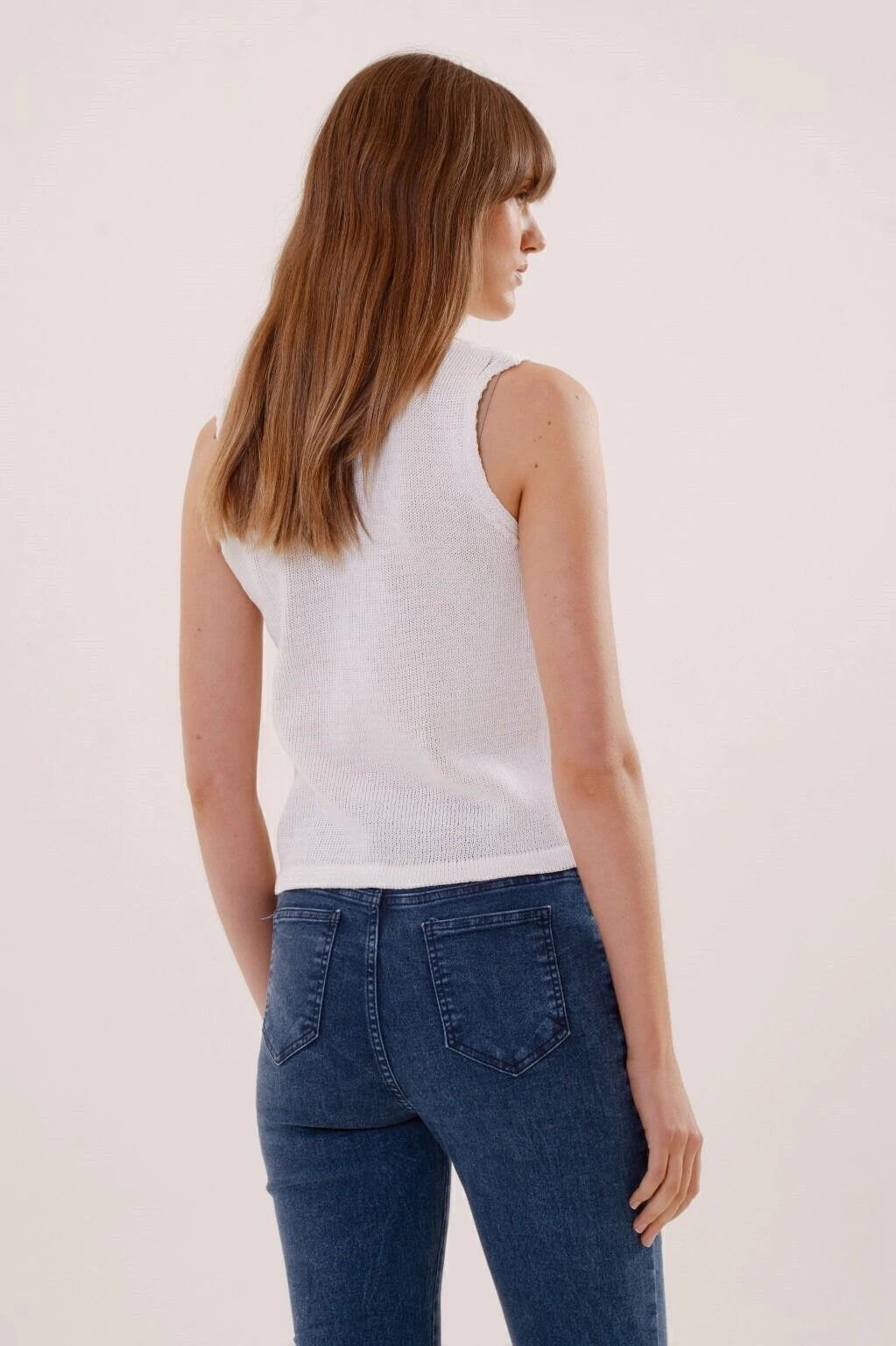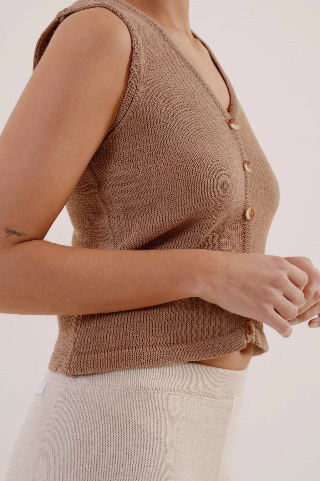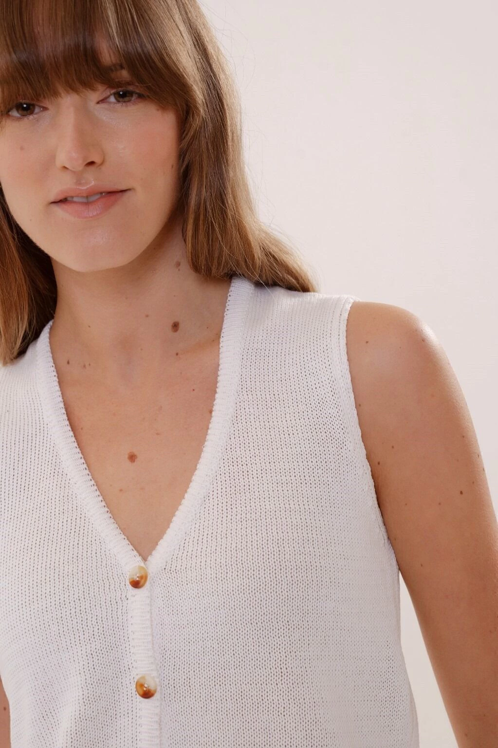 El chaleco Praiano tiene botones al frente de vista y es cerrado; tejido en jersey con hilo rustico de algodón, resulta ideal para vestir fresca y con presencia semi formal.