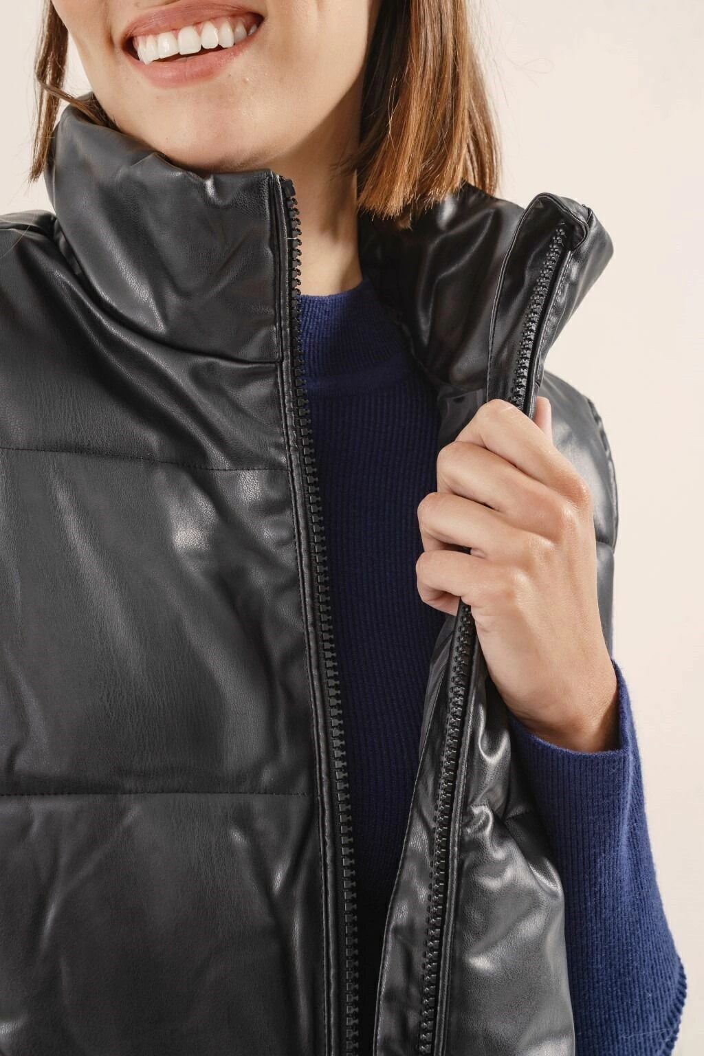 El chaleco aymara semi puffer esta confeccionado en tela simil cuero,con cierre metalico,cuello alto y bolsillos amplios. Perfecto para complementar tu look.