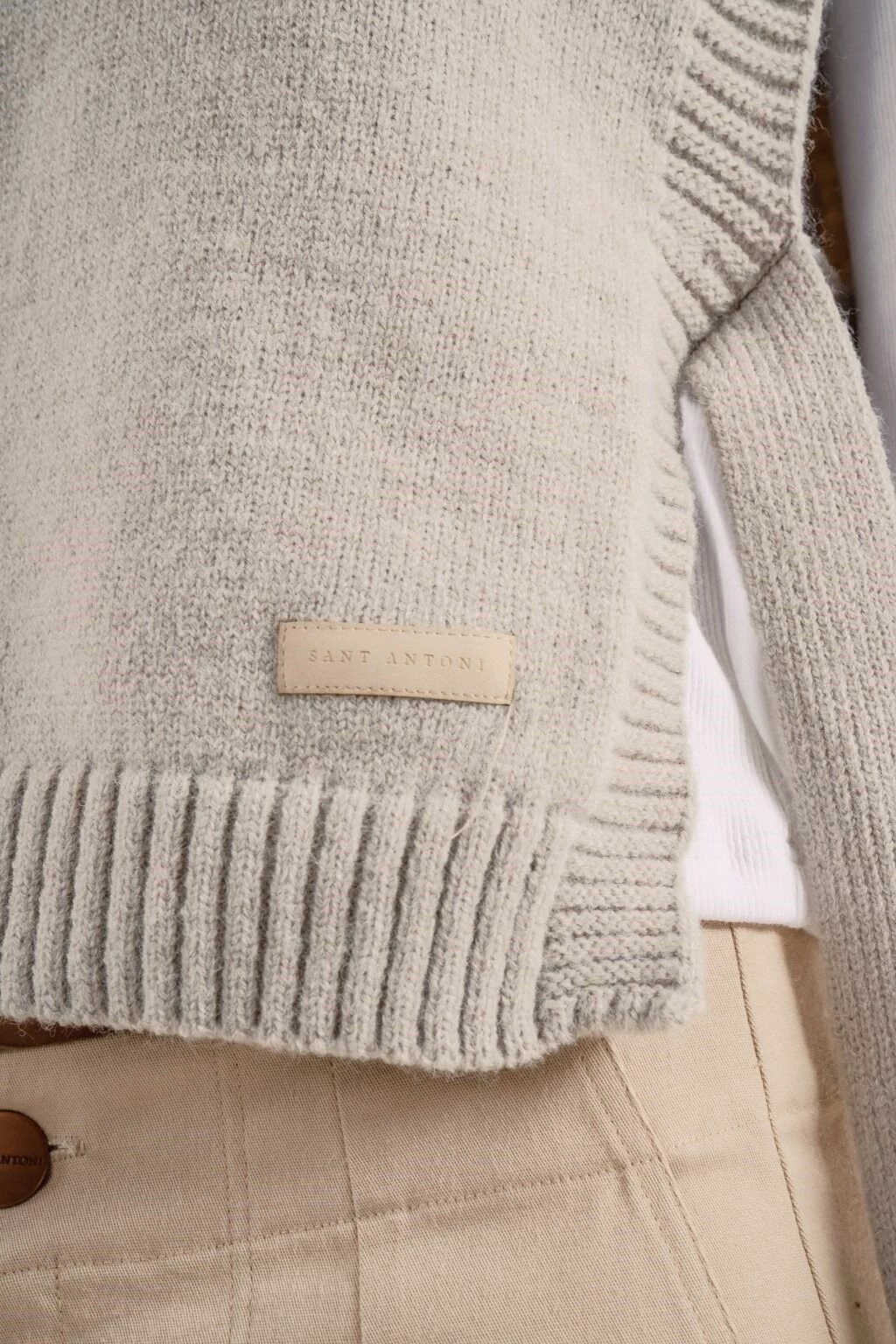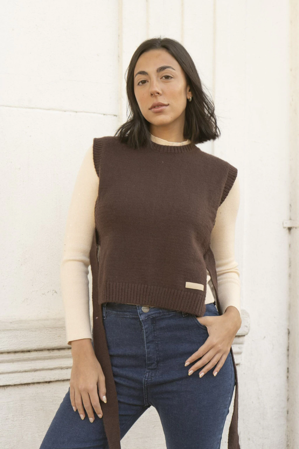 Un chaleco especial: diferentes largos en delantero y espalda, con un lazo para anudar y cuello alto; perfecto para usar con un look relajado.