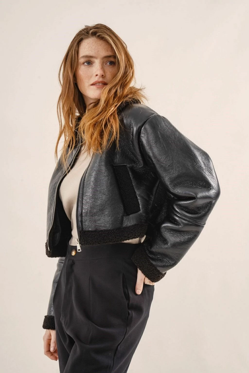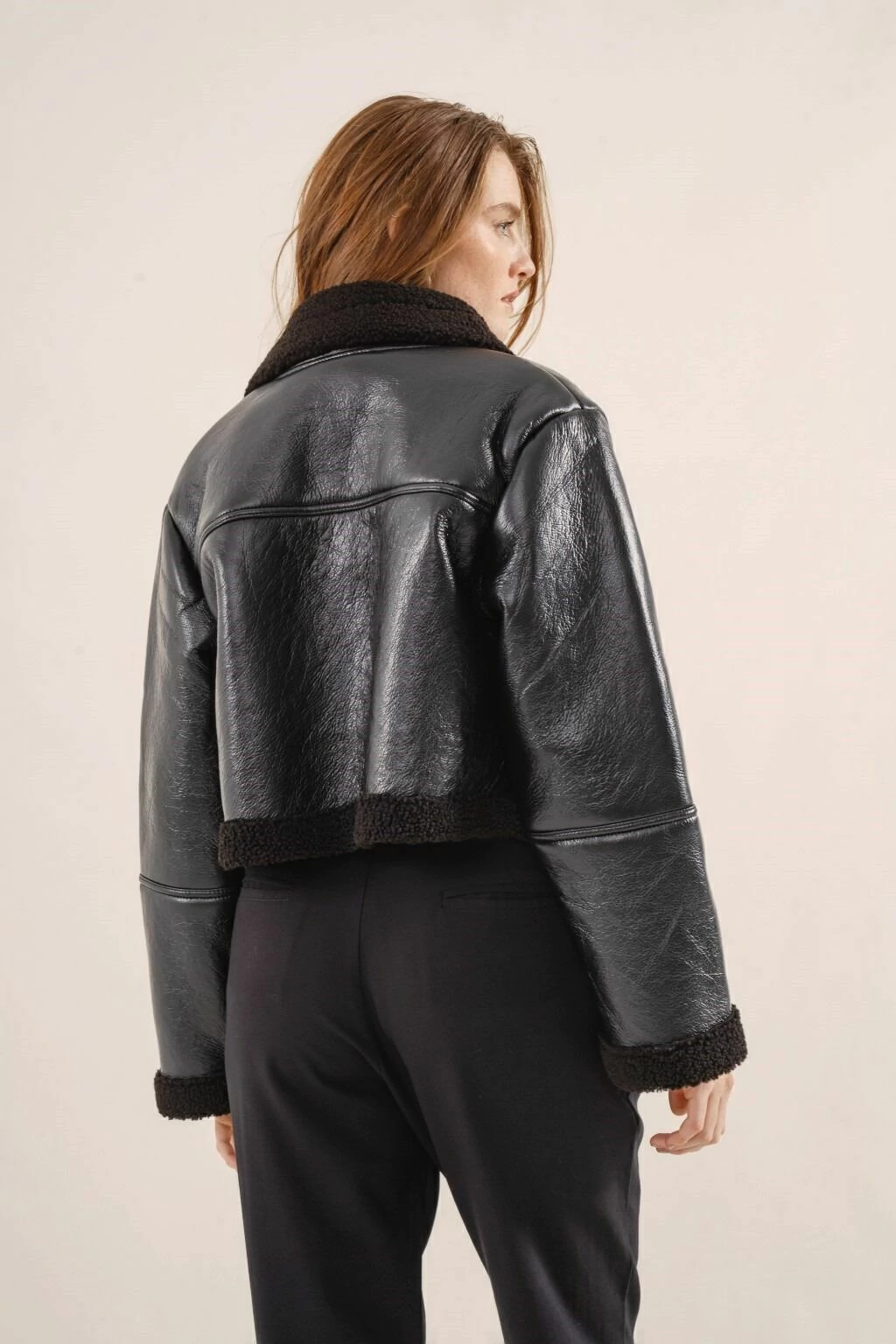 Campera a la cintura, con cierre en el frente y corderito en todo el interior. De material simil cuero brilloso.