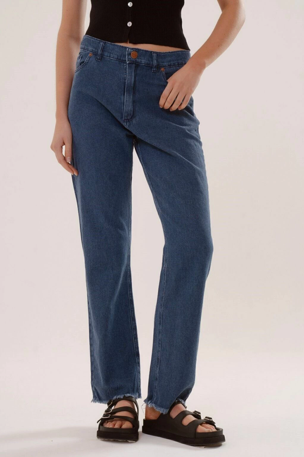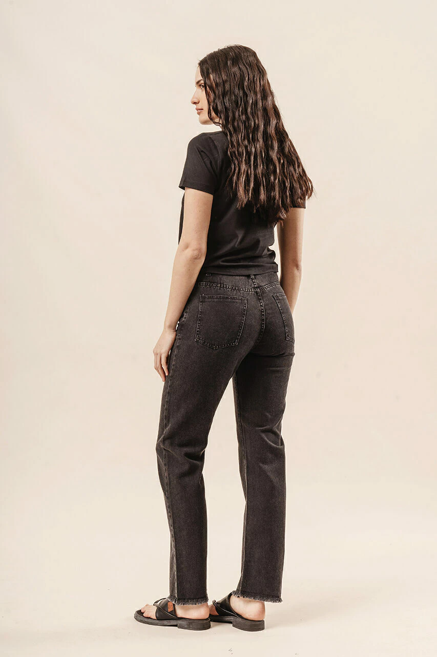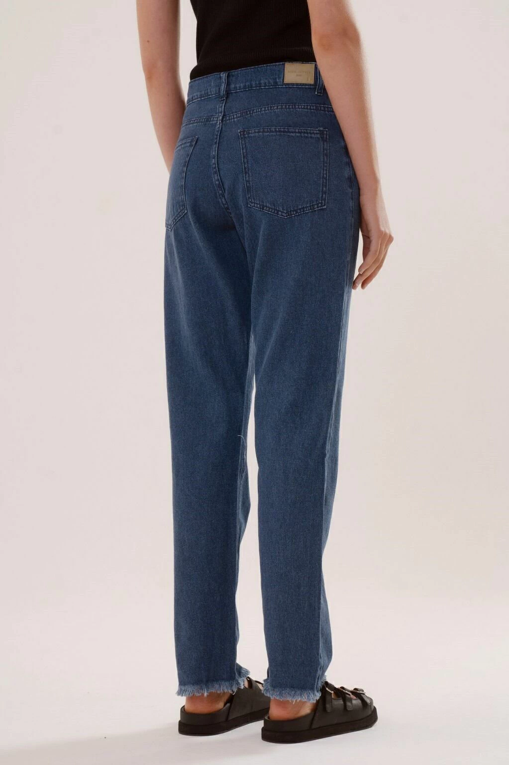 Un jean relajado, recto, amplio y cómodo. De tiro medio y con flecos en botamangas. Un básico del guardarropas.