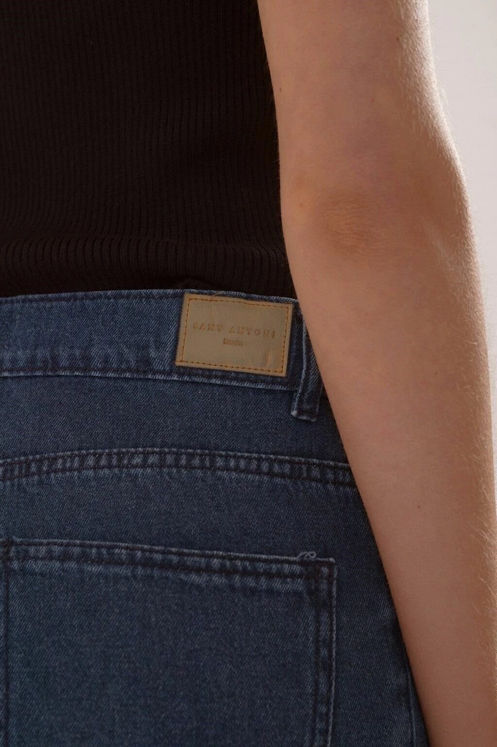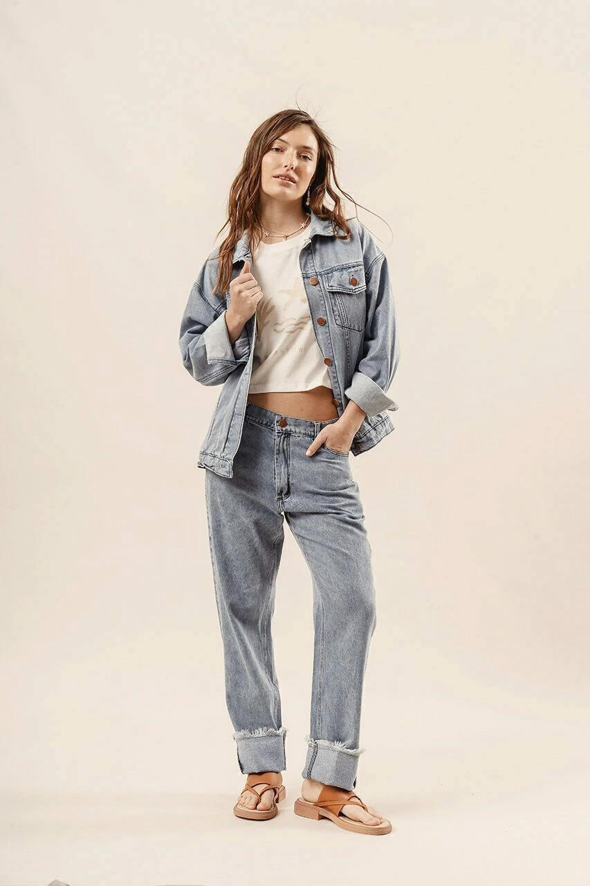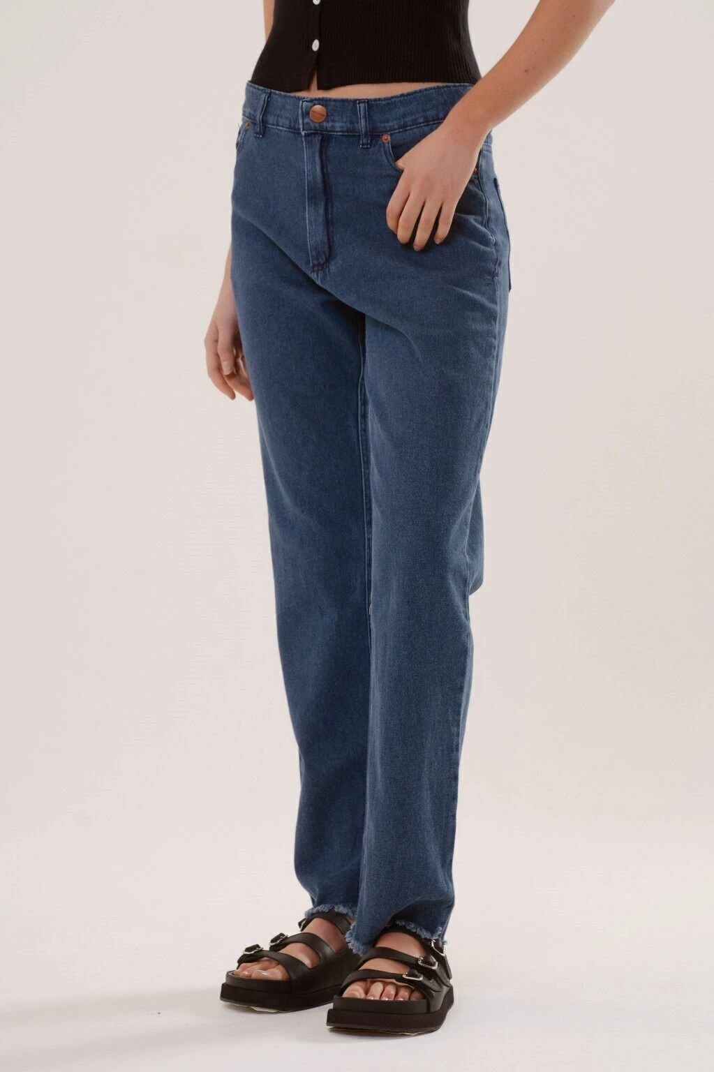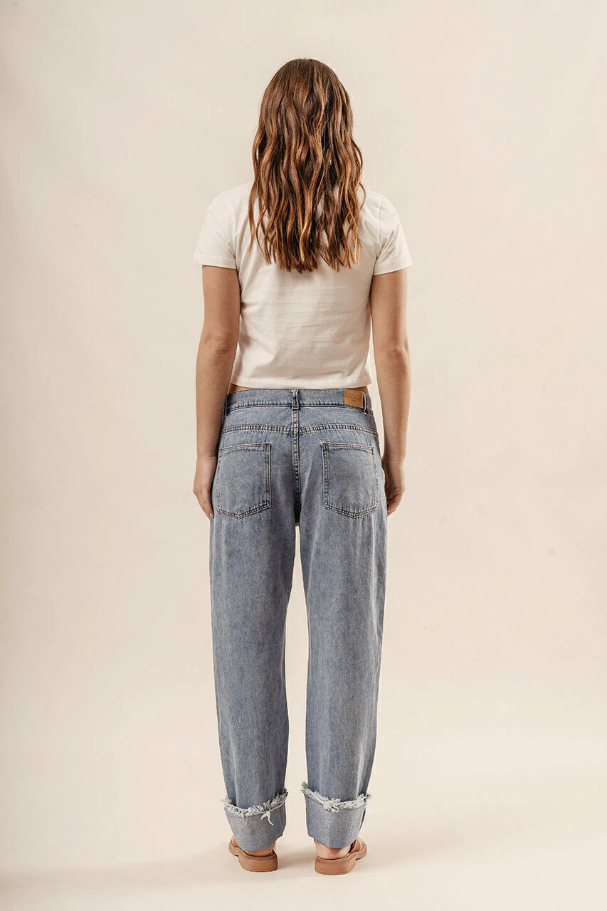 Un jean relajado, recto, amplio y cómodo. De tiro medio y con flecos en botamangas. Un básico del guardarropas.