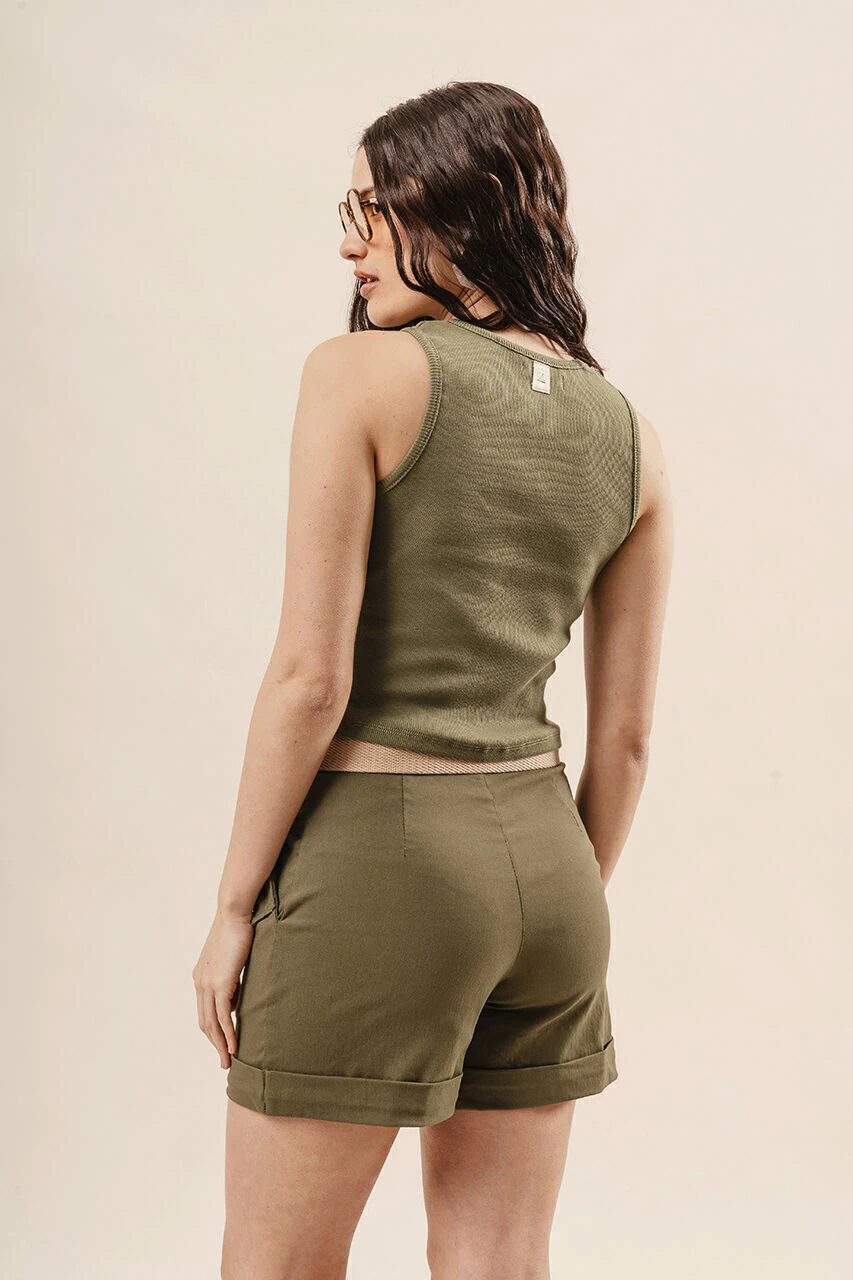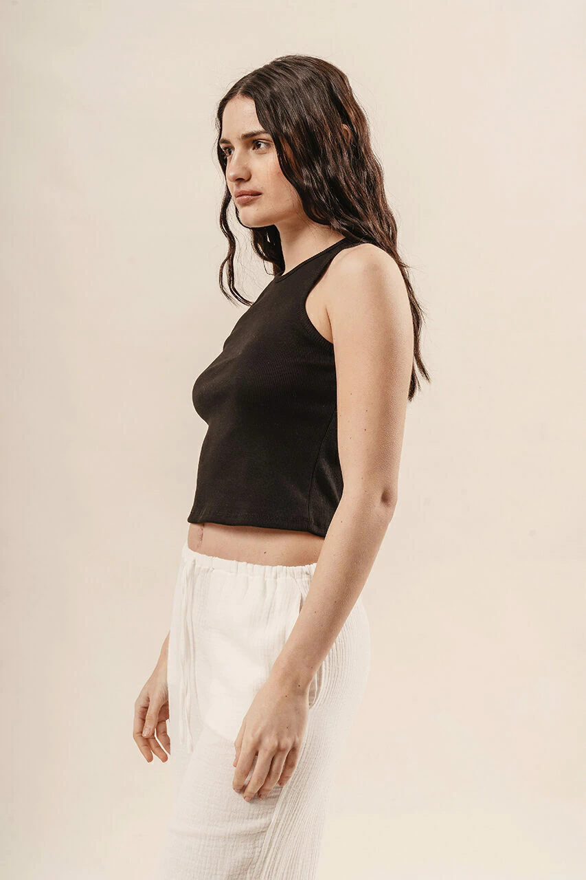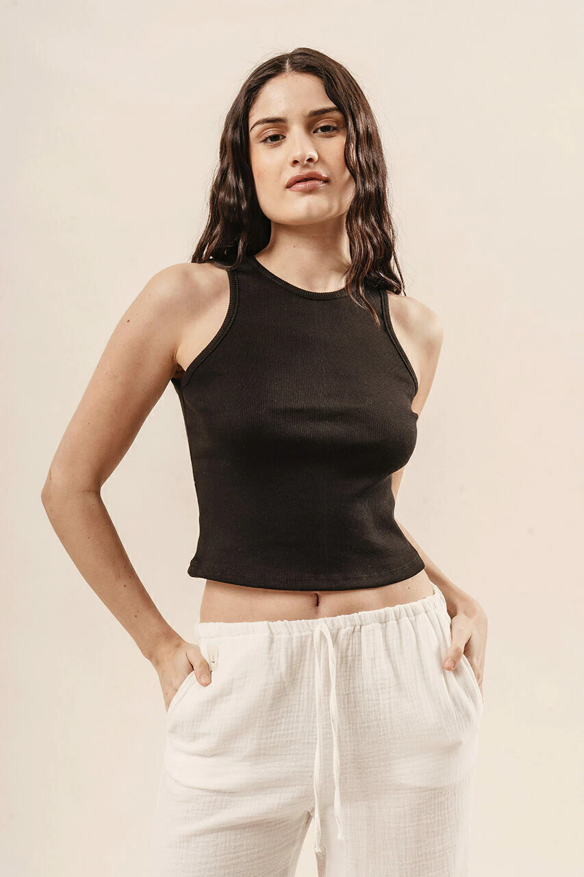 Una musculosa clave de la temporada, de sisas cavadas y silueta corta es ideal para usarla en alto verano.