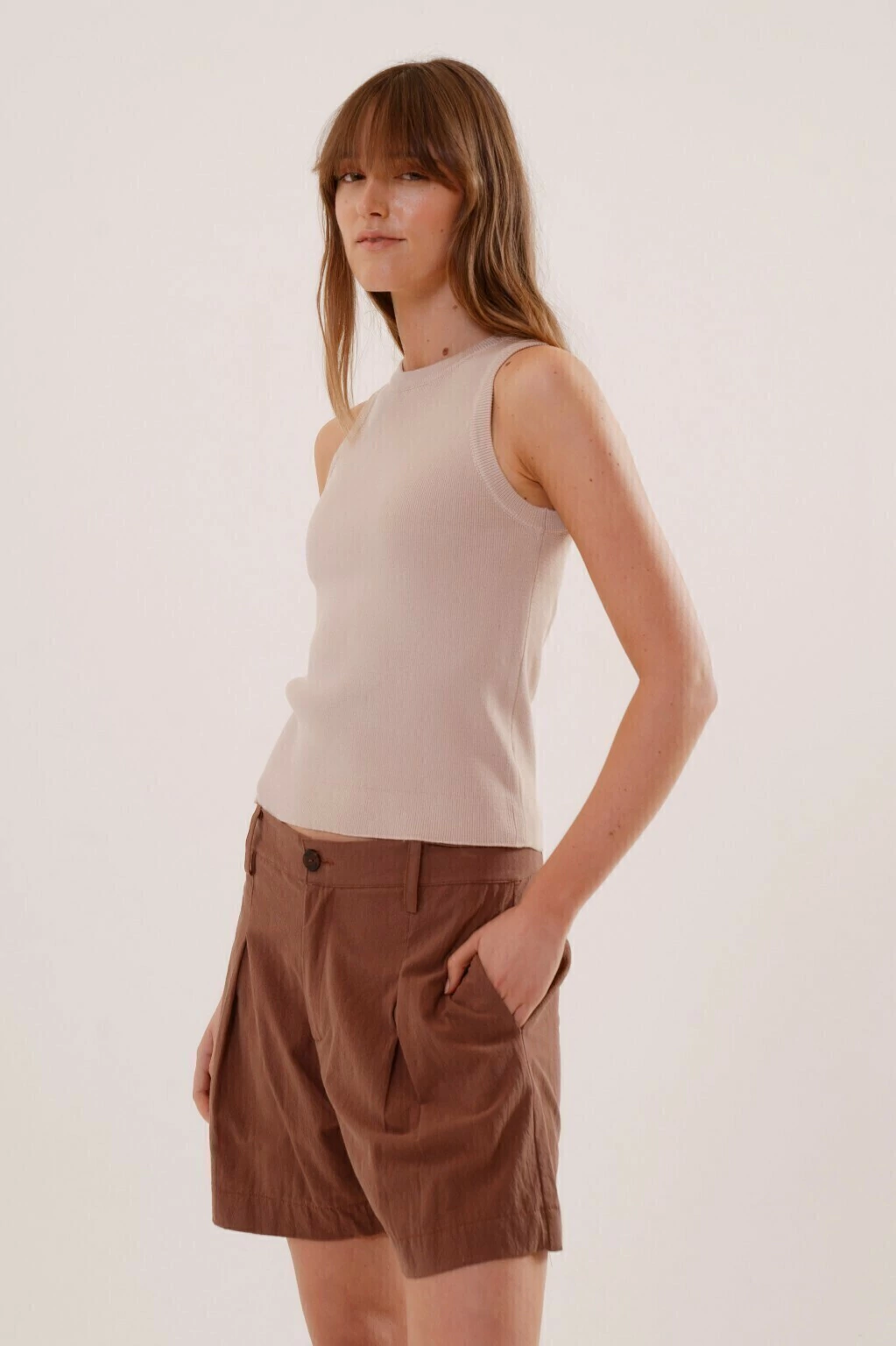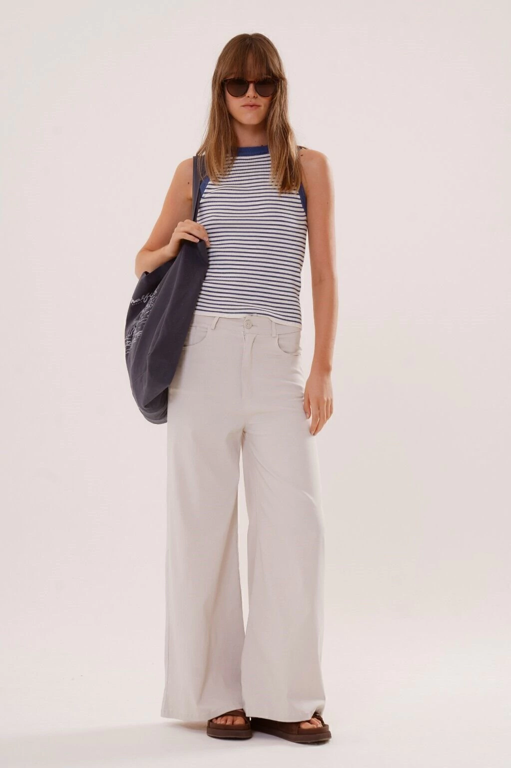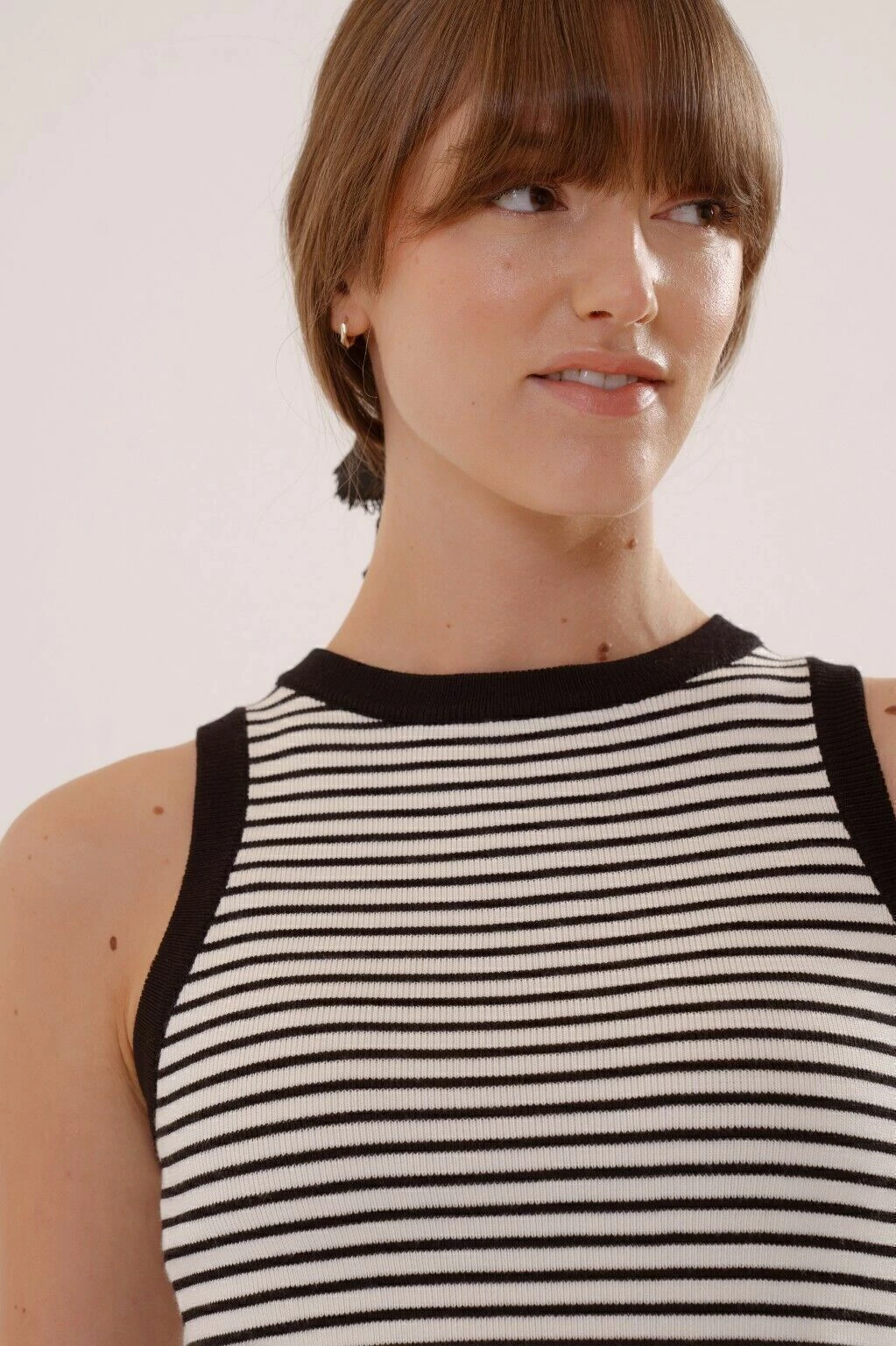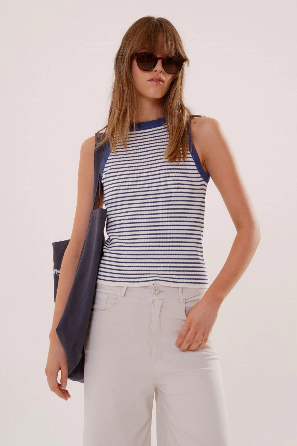 Una musculosa de textura suave, con rayas finas. Un clasico del estilo nautico con silueta chic.