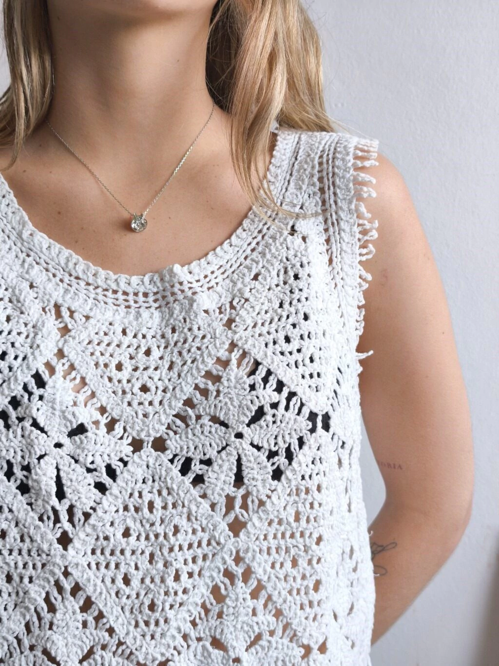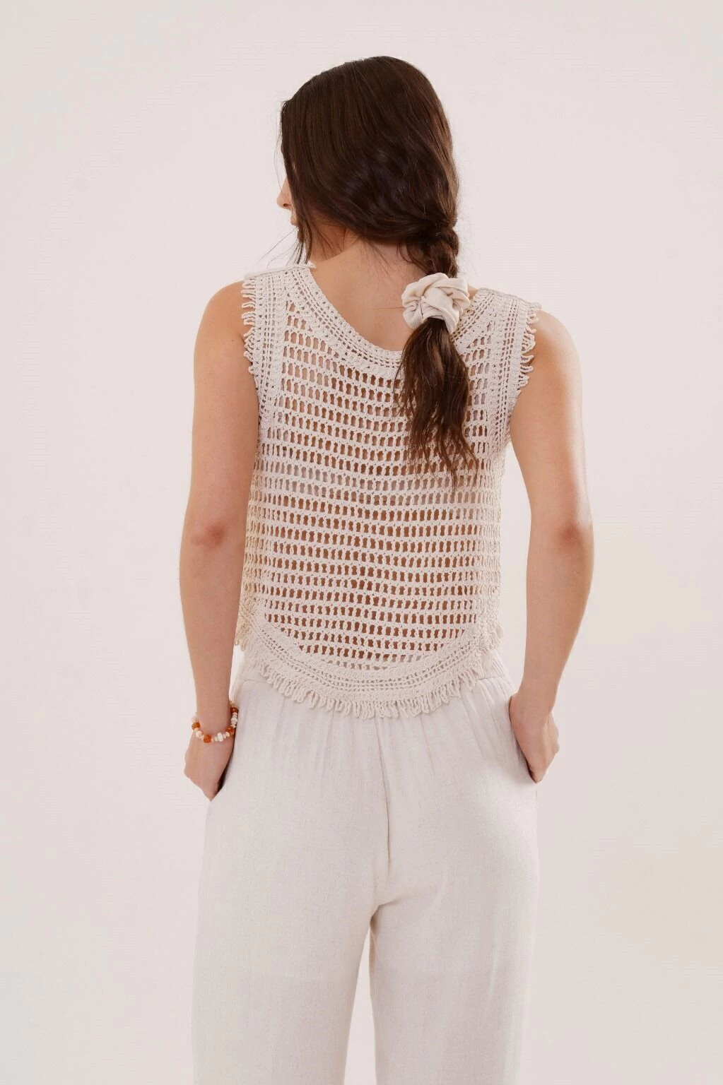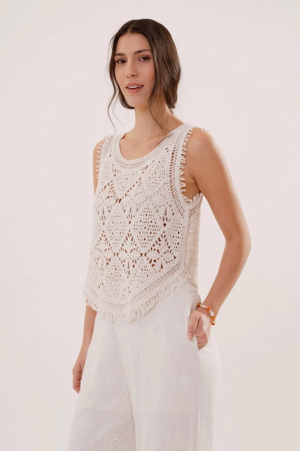 La musculosa Grotta: de silueta holgada, de largo medio, esta tejida en crochet con punto calados, dibujando rombos rusticos. la prenda contiene detalles de flecos en sisas y bordes inferiores. Prenda tejida con puro algodón.