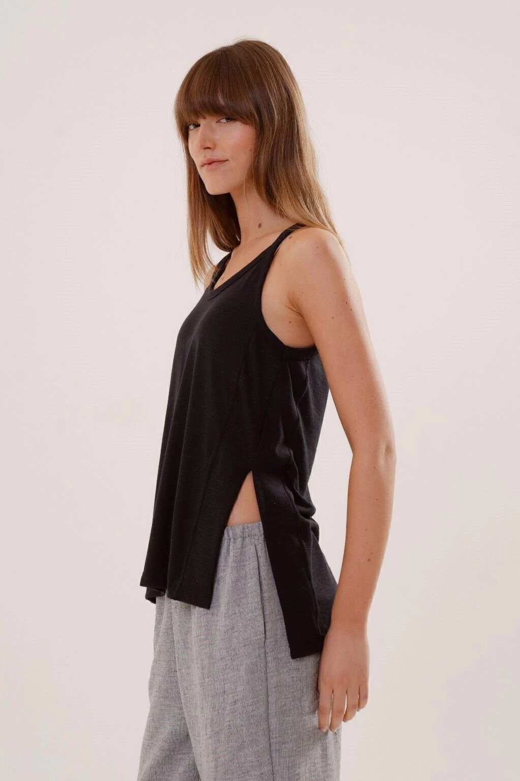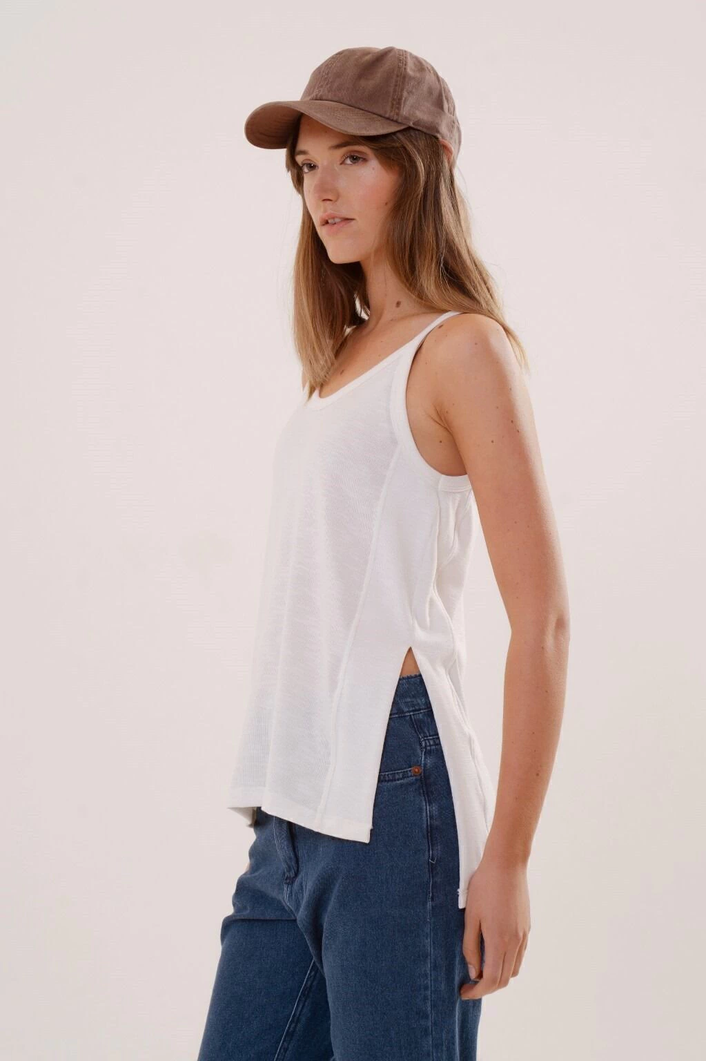 La musculosa Praie: una prenda para usar en el dia a dia, muy comoda y de silueta al cuerpo. Presenta detalles como tajo lateral con recortes anchos, diferencia de largos entre frente y espalda y sisa cavada.