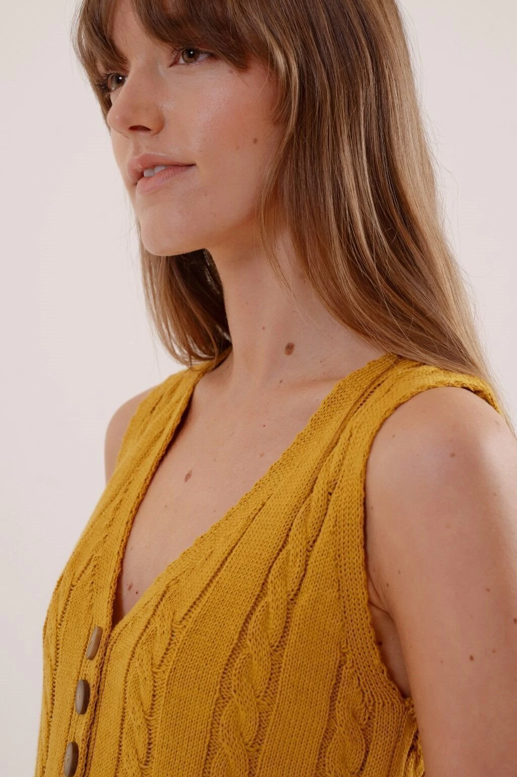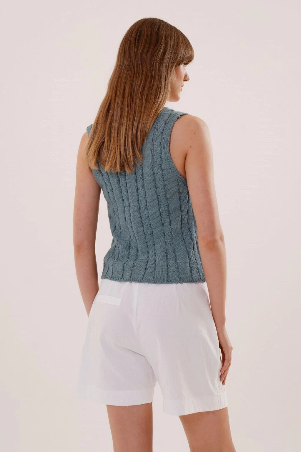 La musculosa Zucca, tejida con trenzas y de escote V, es una prenda que destaca con su textura y acceso delantero.
