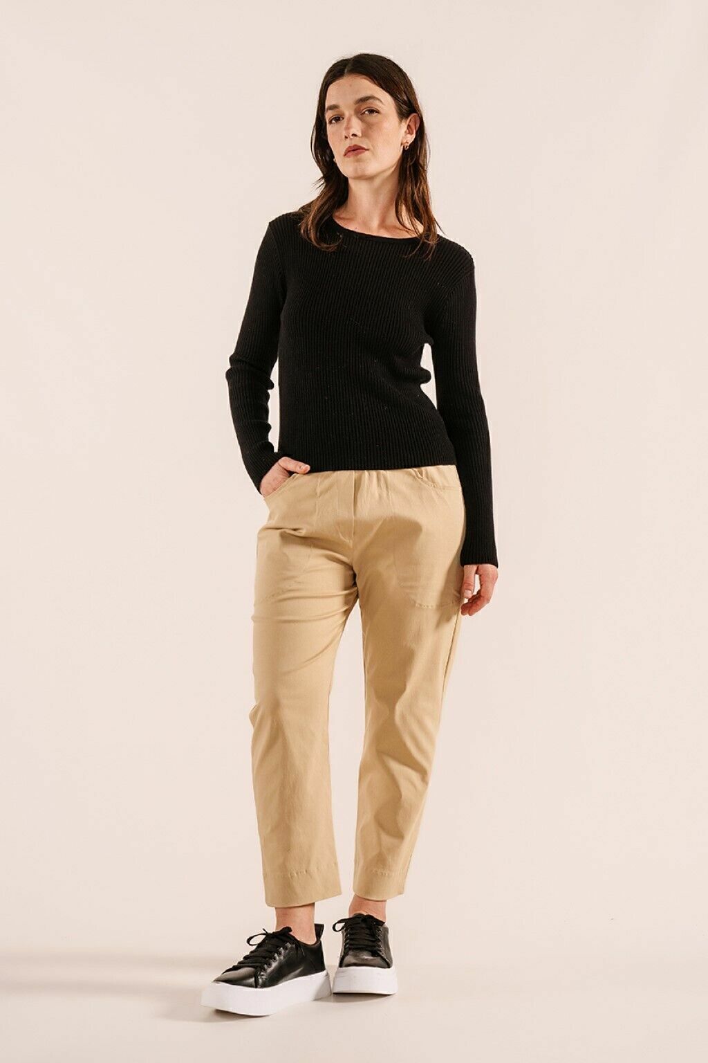 Nuestro pantalon algarrobo,confecionado en tela adaptable al cuerpo, tiene cintura elástica y bolsillos amplios. De silueta semi baggie resulta muy comodo.