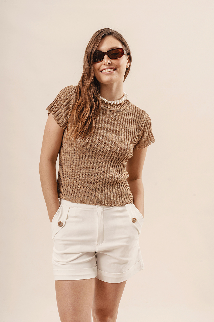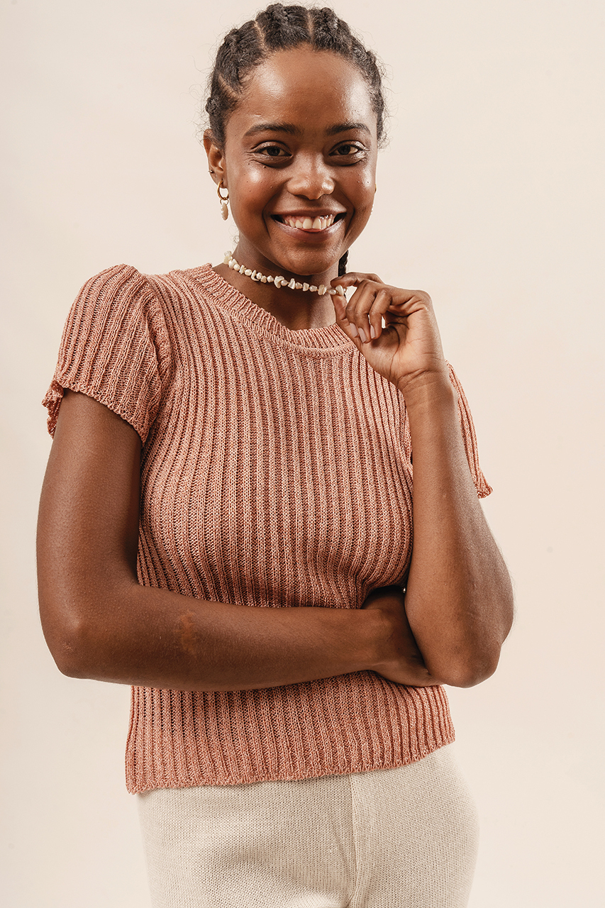 Nuestra remera Acanella, tejida en hilado con lurex y en punto Morley, se puede lucir tanto de dia como de noche.