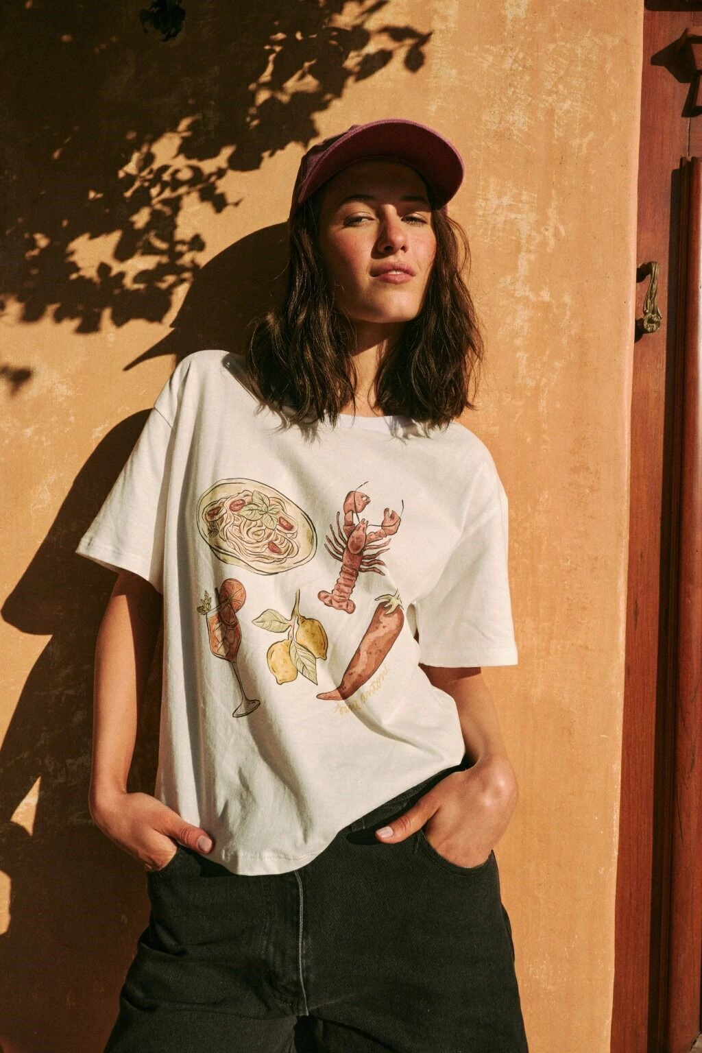El remerón Pasta, de silueta amplia y suelta, esta estampada con un diseño original de estilo gastronomica de Amalfi. Confeccionada en tela jersey algodón 100%, muy suave y confortable.