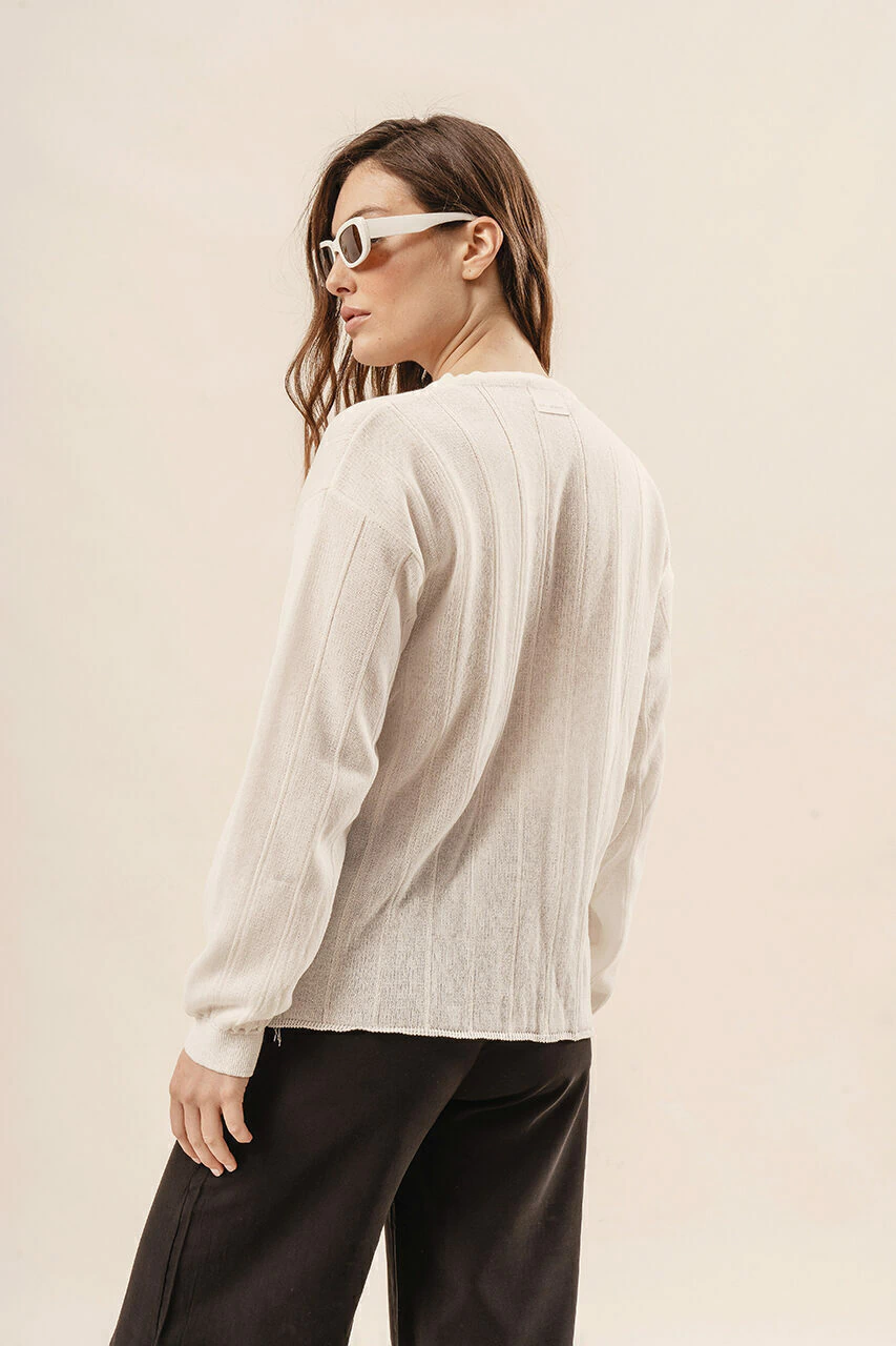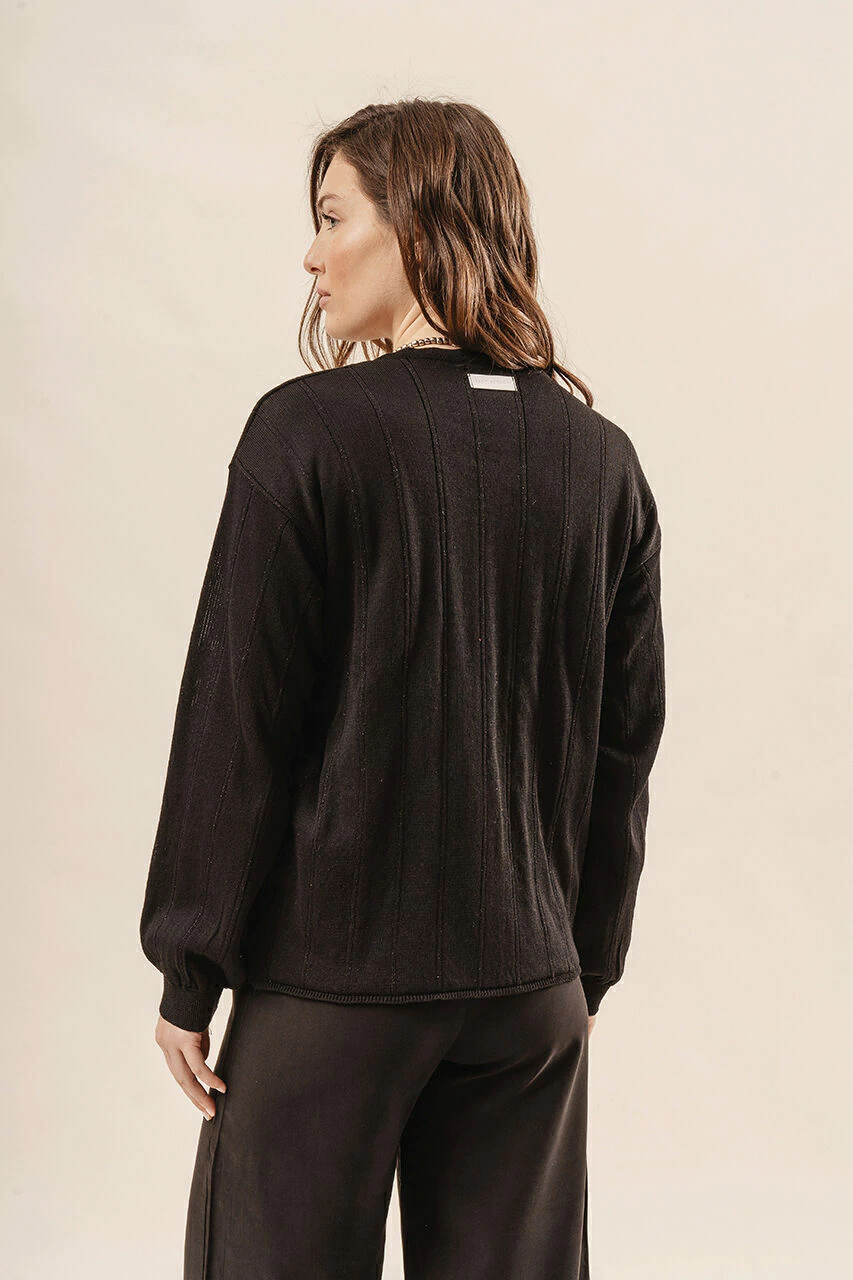 El sweater Nacar combina dos hilados que conviven muy bien en su contraste: en lineas verticales con lurex (brillo sutil) y algodón fino que la convierten en una prenda original y unica.