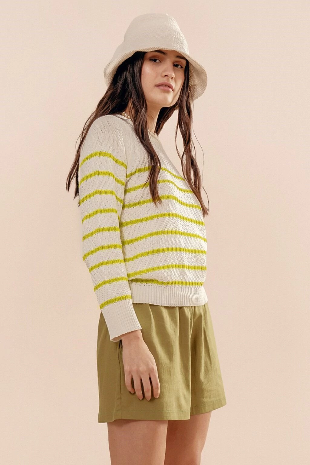 El sweater ondulita rayado fué pensado para media estacion como tambien para dias mas frescos. Con el punt arroz doble y lineas rayadas finas es un elegido para el trend verano.