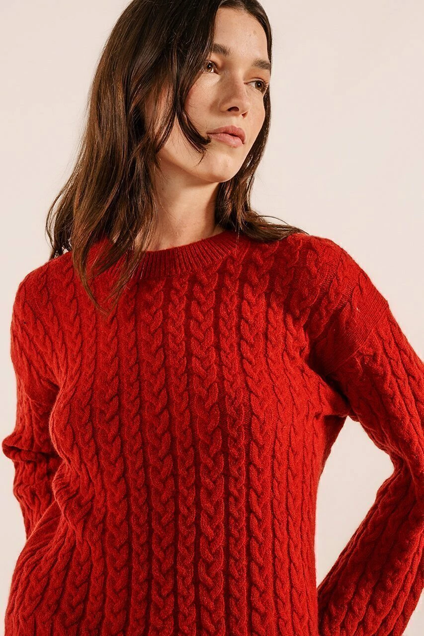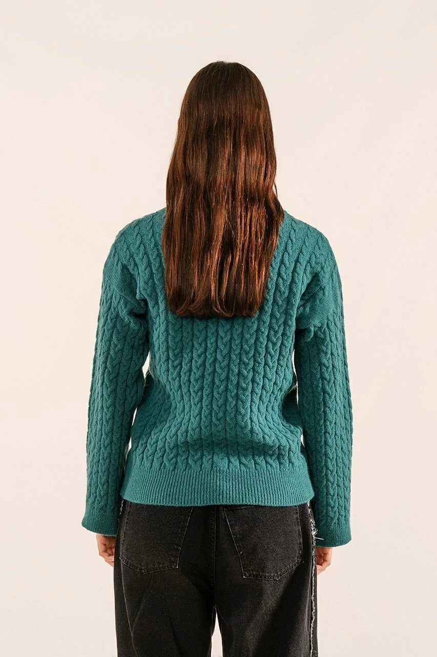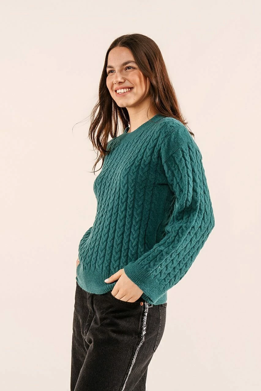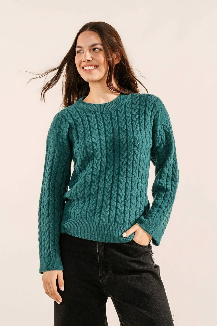 El sweater romeral, de textura mix de trenzas en relieve. De escote redondo y mangas caidas; con silueta recta y holgada, de mangas amplias, asegura comodidad y abrigo.