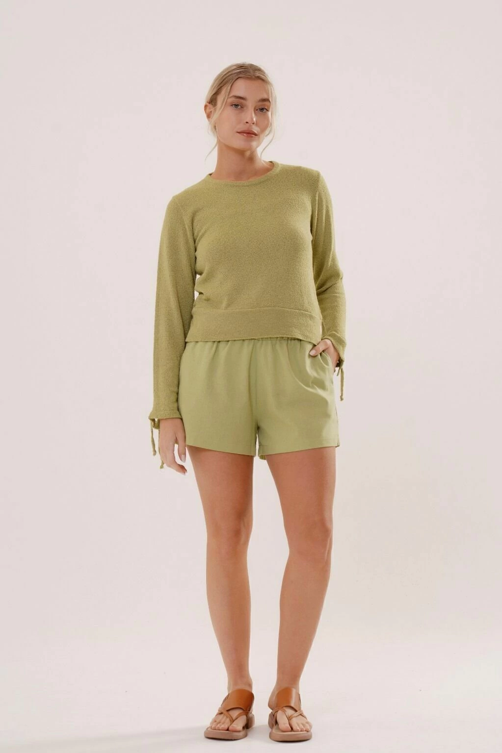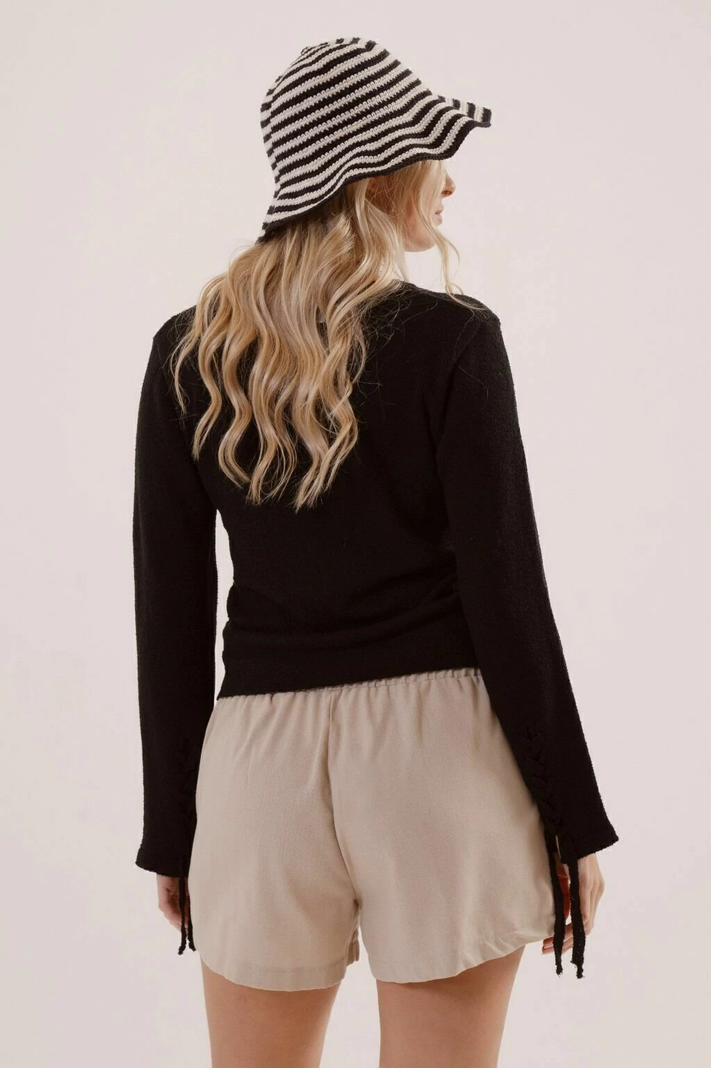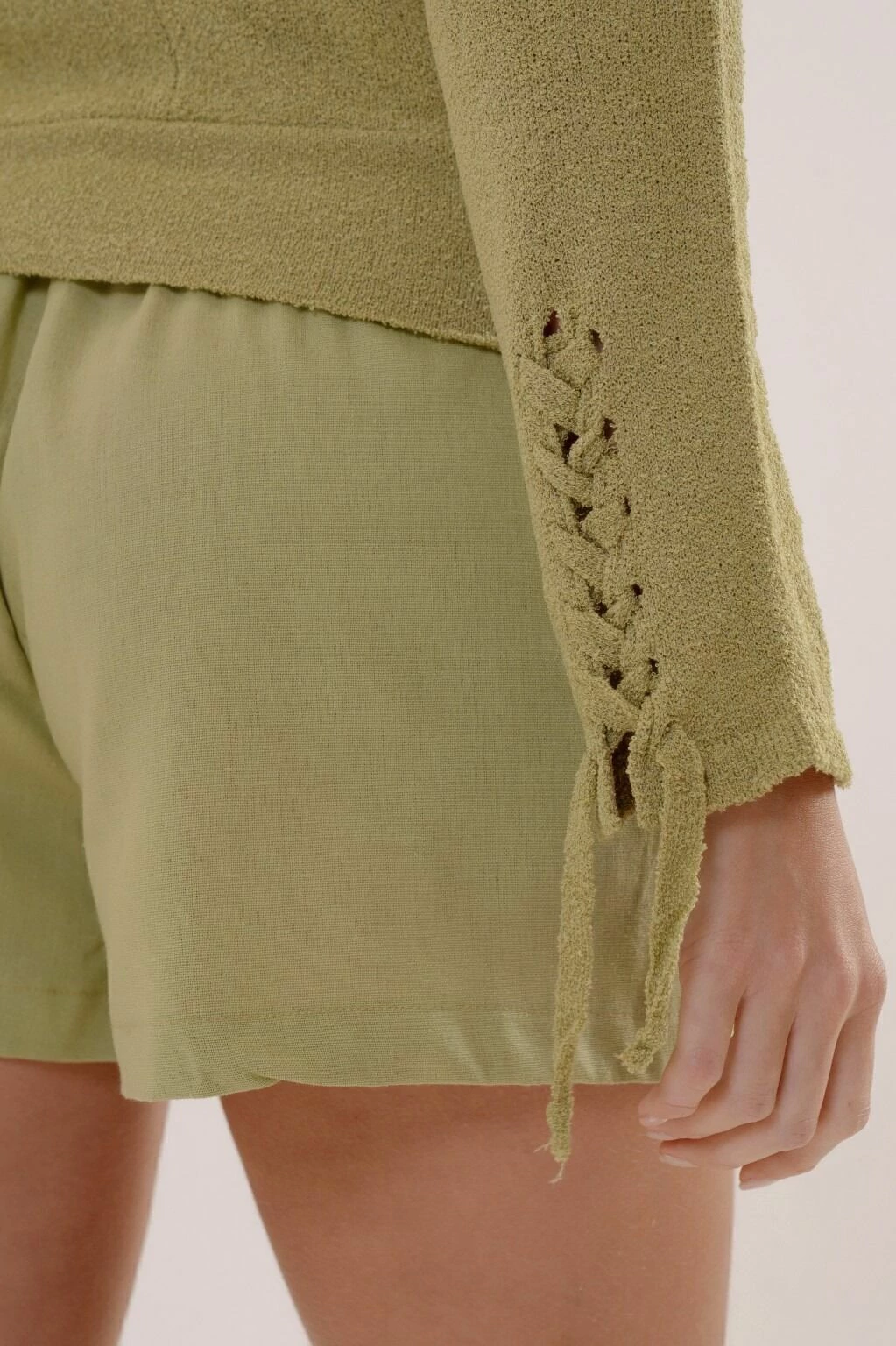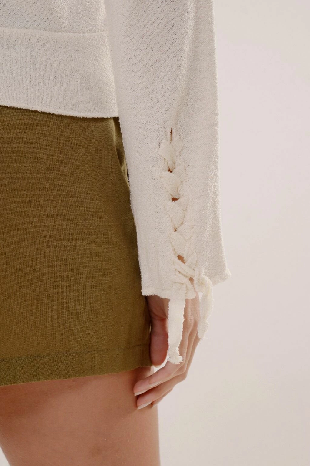 El sweater Spiaggia destaca por los detalles de trenzado en mangas y ruedo ancho, fiel a la línea veraniega. Tejido en hilo bucle, que otorga una textura especial.