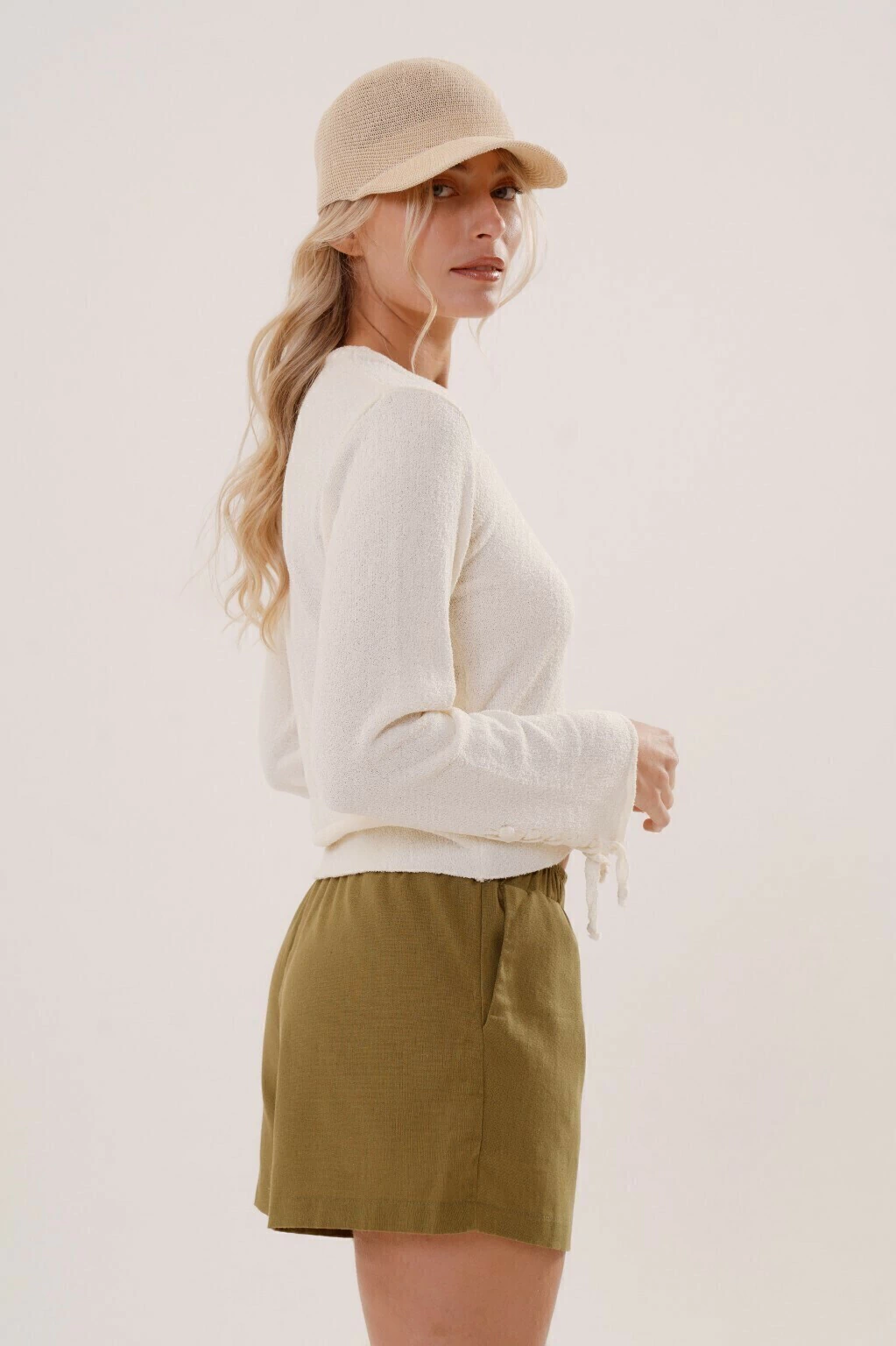 El sweater Spiaggia destaca por los detalles de trenzado en mangas y ruedo ancho, fiel a la linea veraniega. Tejido en hilo bucle, que otorga una textura especial.