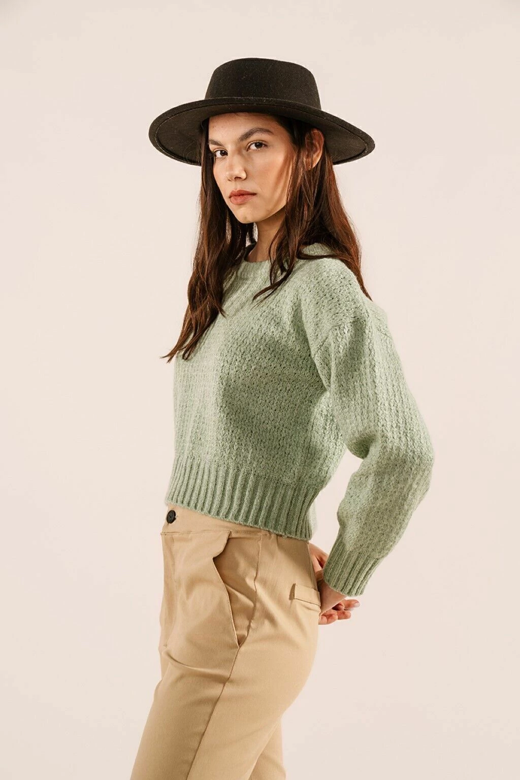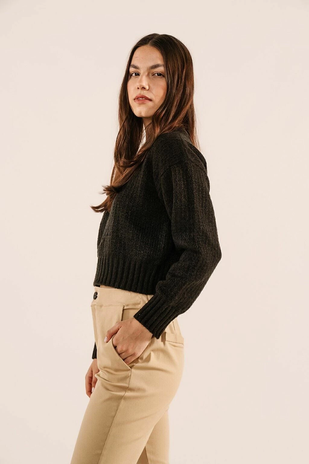Un sweater a la cintura, escote redondo y hombros caidos.El hilado Fancy ofrece abrigo y su textura versatilidad en el uso con cualquier prenda.Ideal para looks cotidianos.
