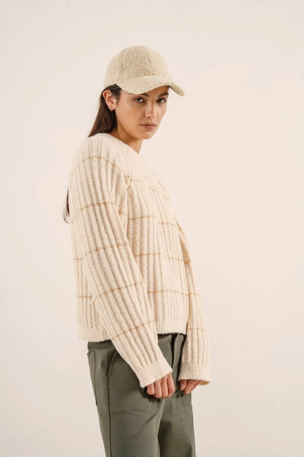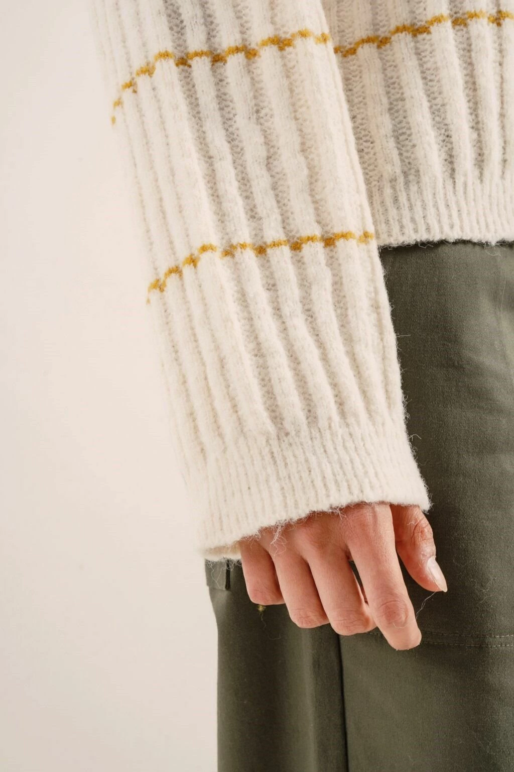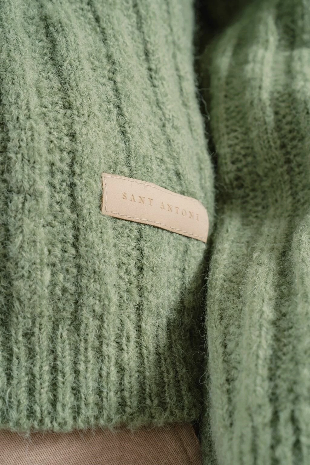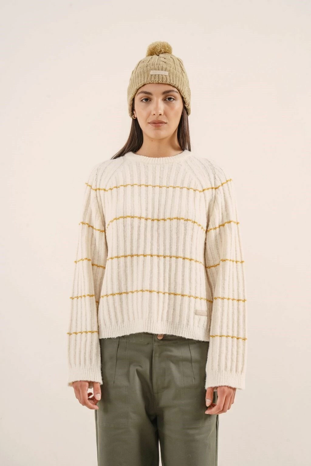 El sweater ceibo, de manga ranglan y tejido en punto acanalado grueso,con hilado alpes. De silueta recta y suelta.