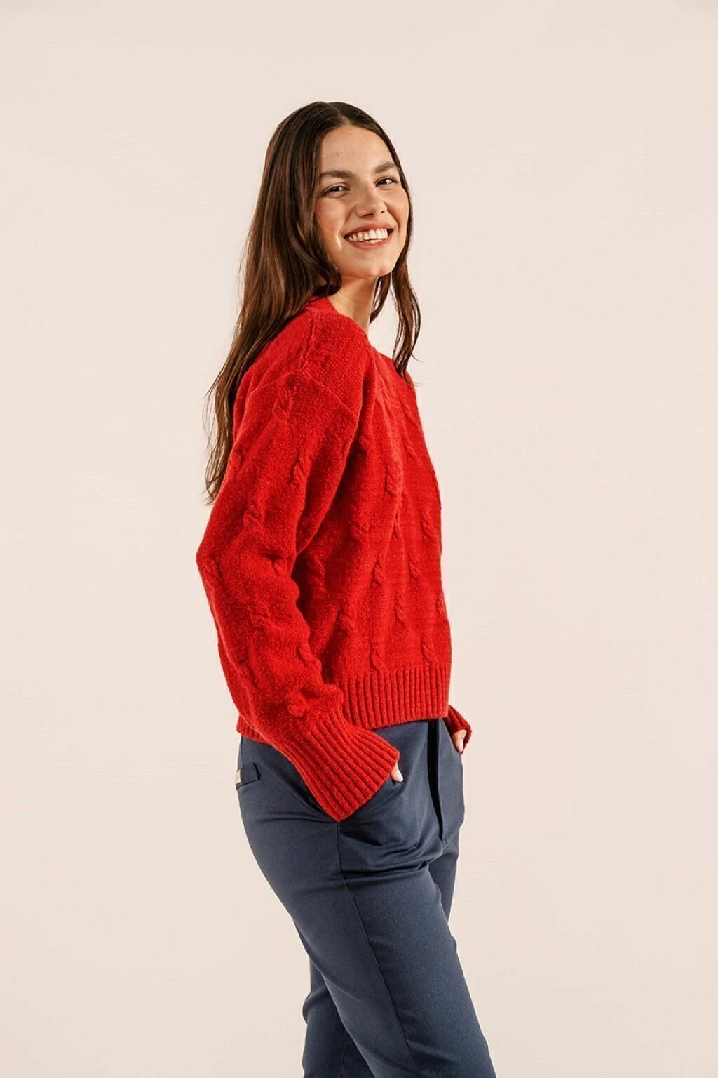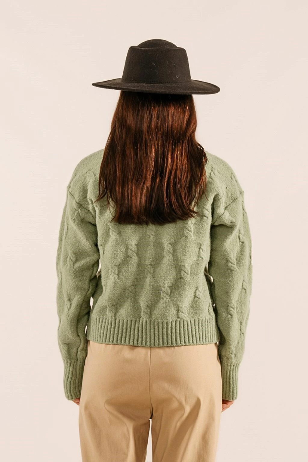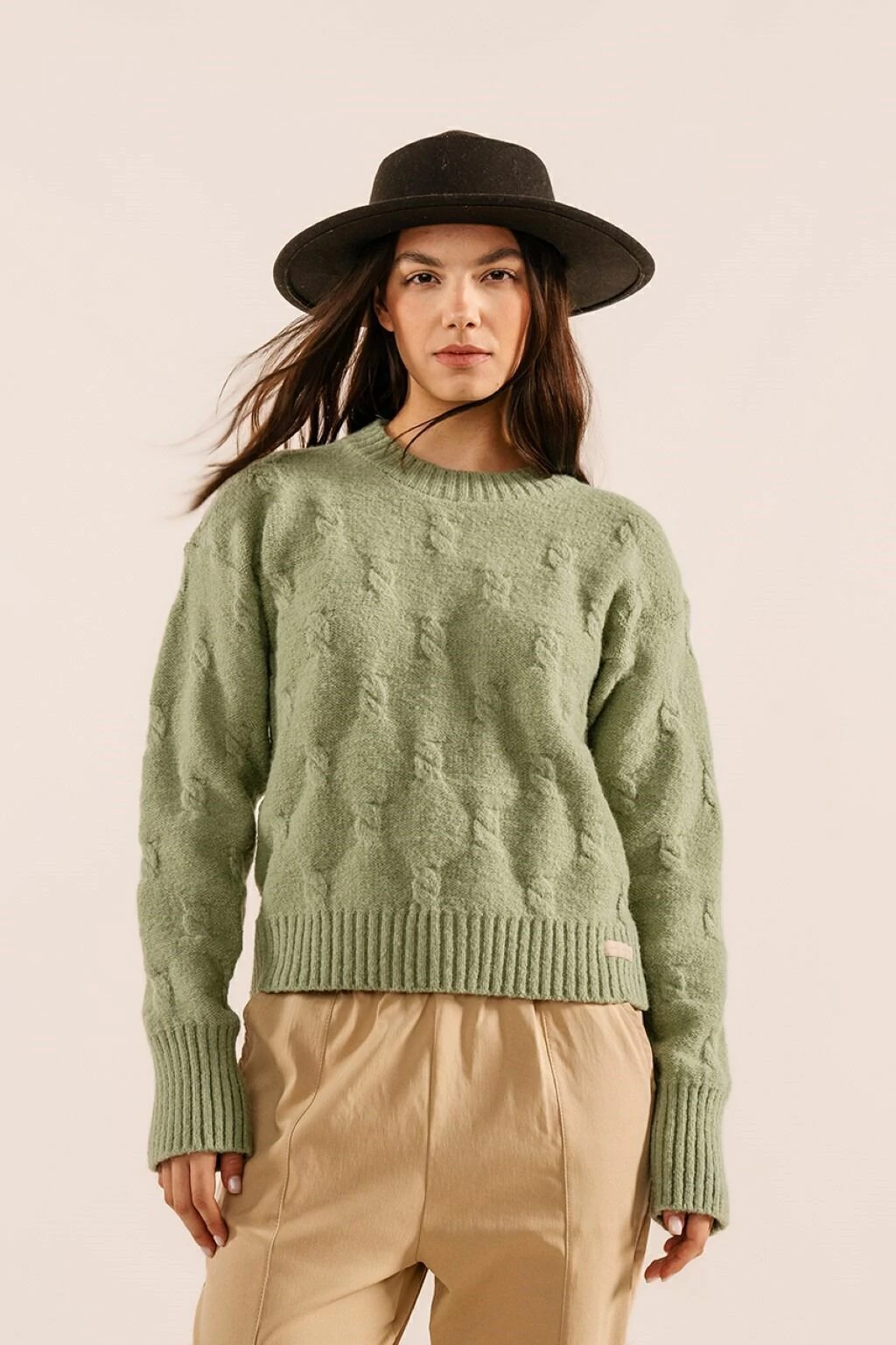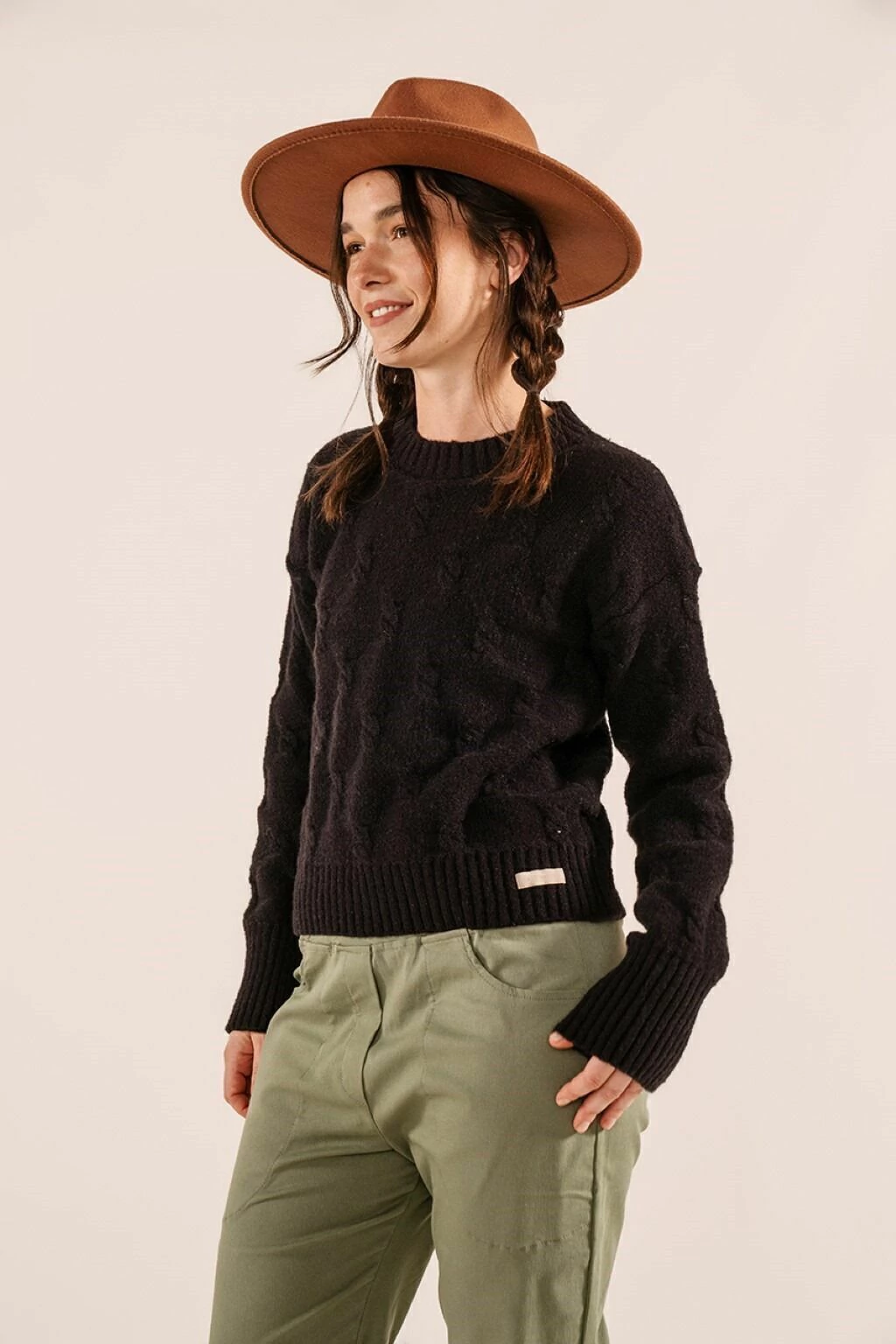 Un sweater con estilo rustico, con su textura de ochos y jersey del reves que lo destacan. Es una prenda muy abrigada y suave.