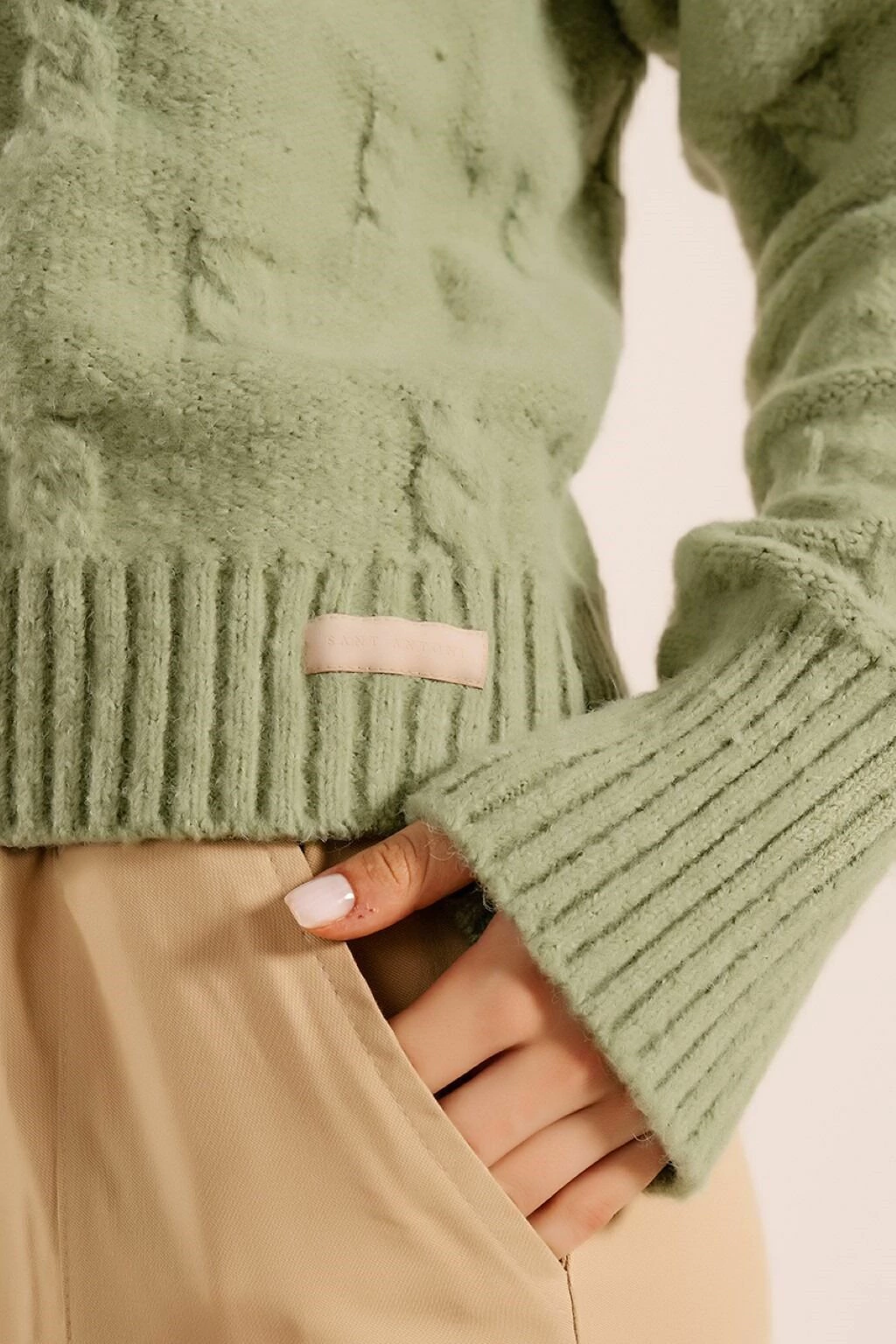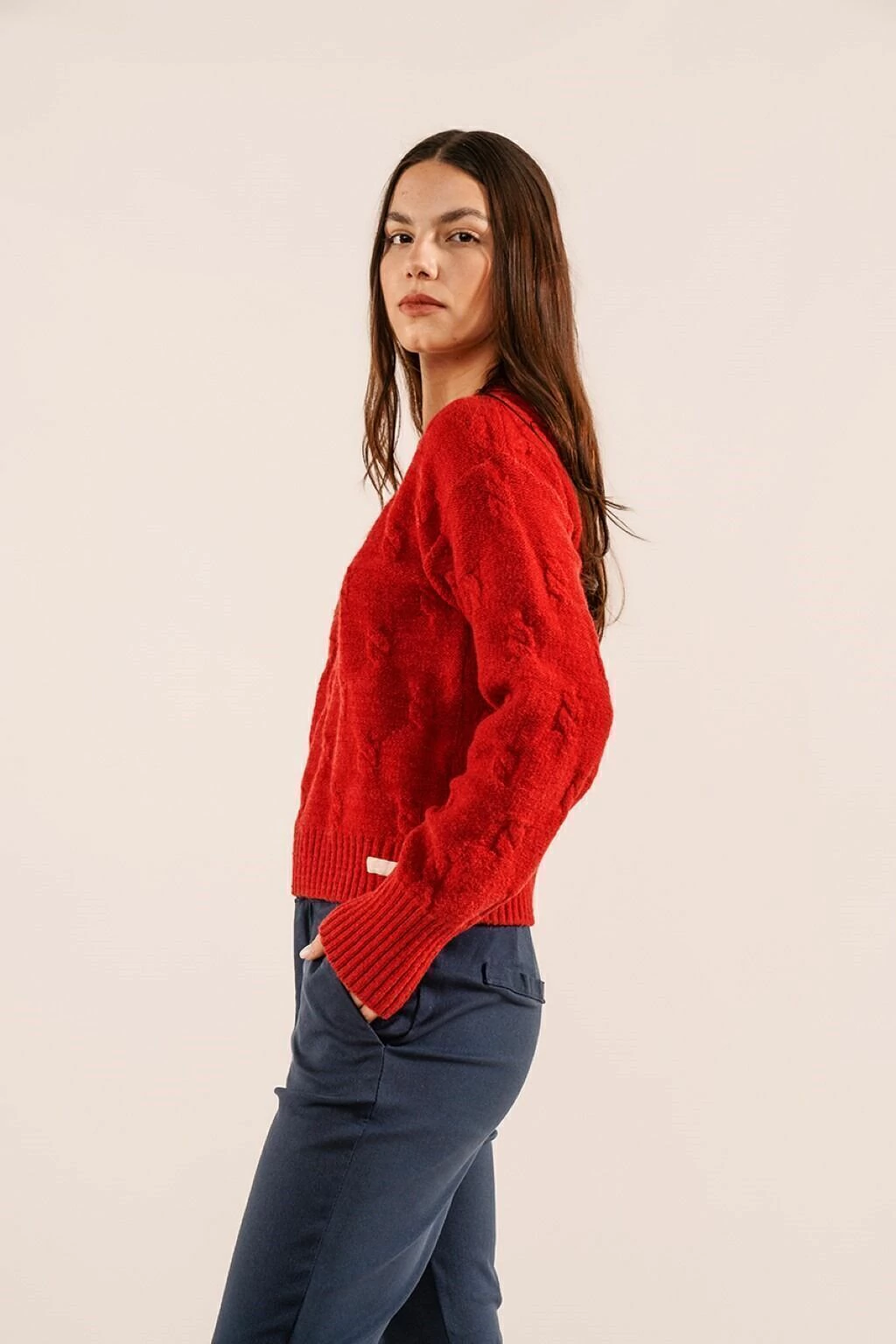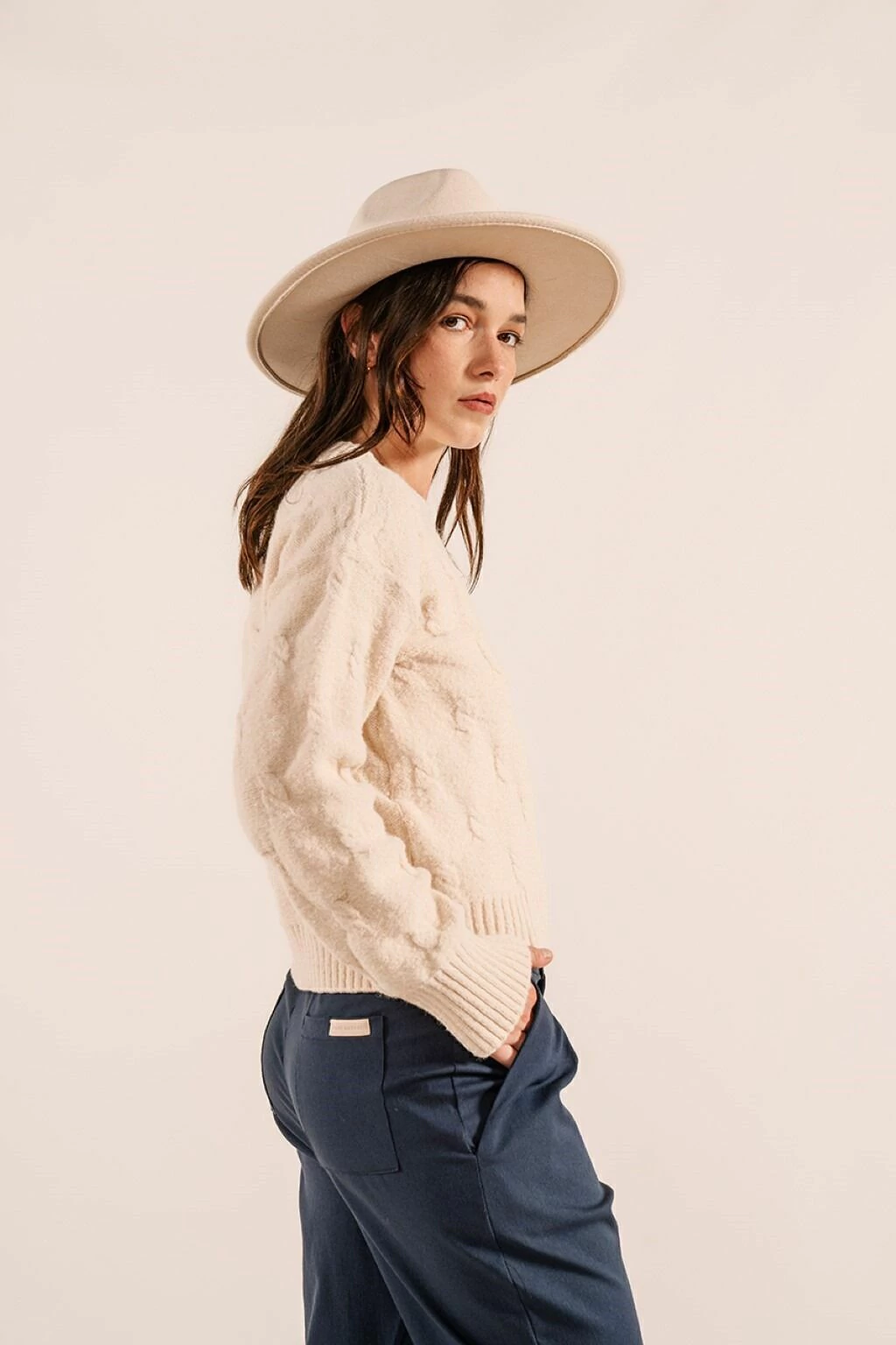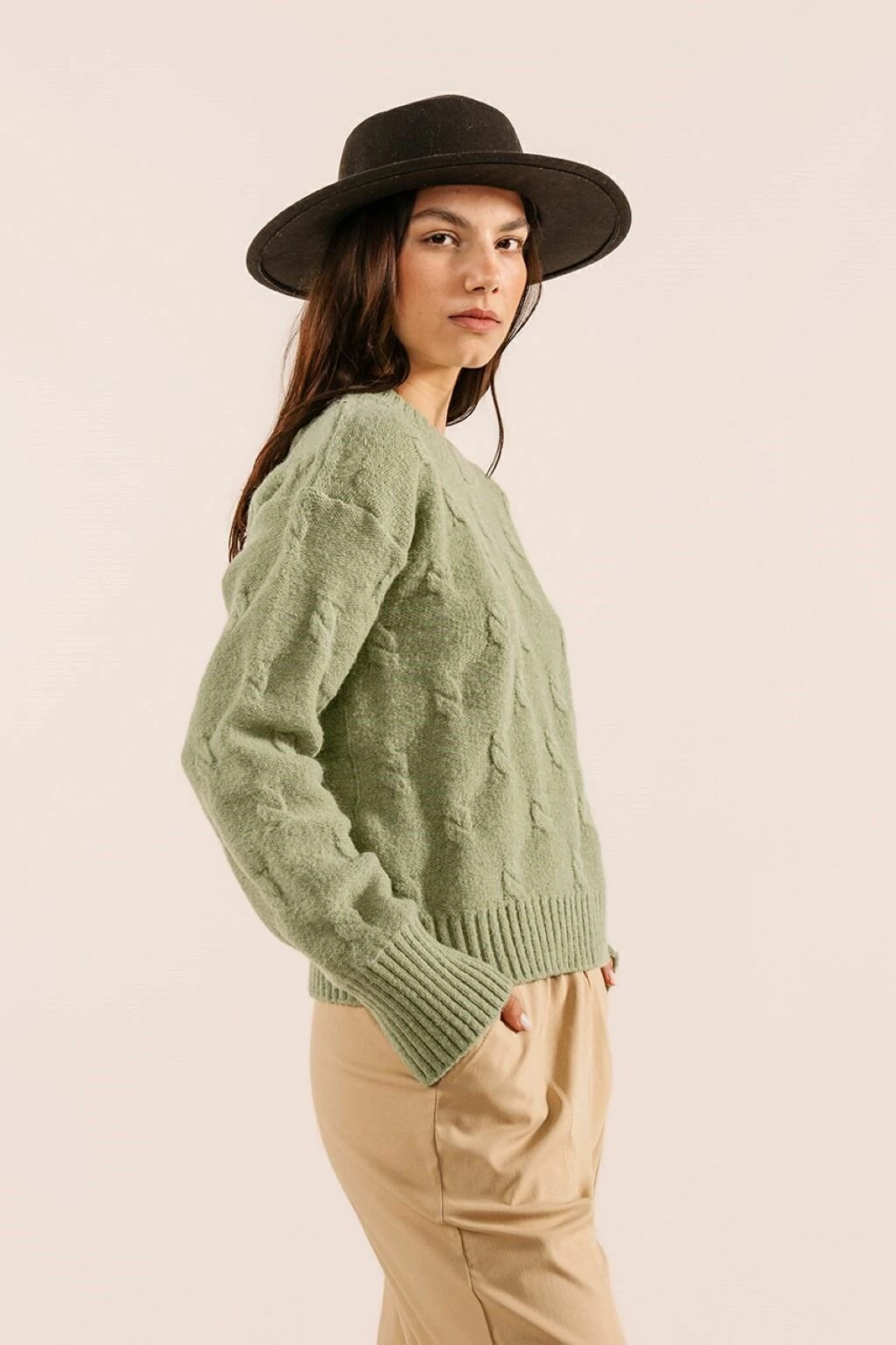 Un sweater con estilo rustico, con su textura de ochos y jersey del reves que lo destacan. Es una prenda muy abrigada y suave.