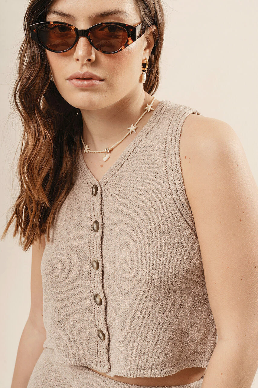 El top Yodo, tejido en hilado buclé y con botones en el delantero, es una prenda fresca e ideall para usar en conjunto con un pantalon o pollera.