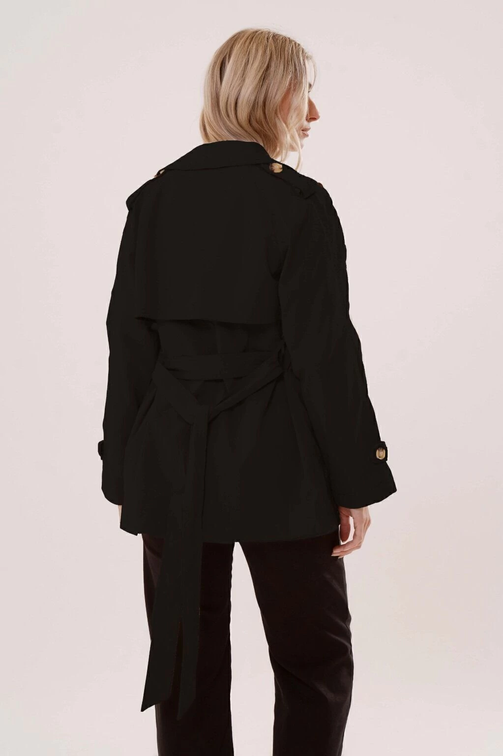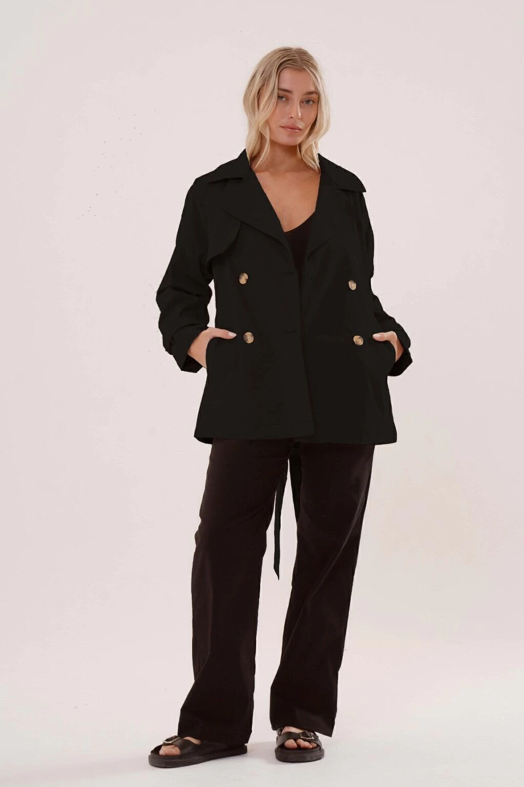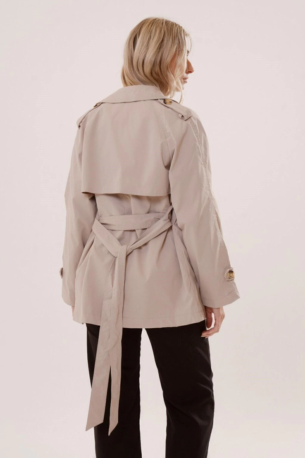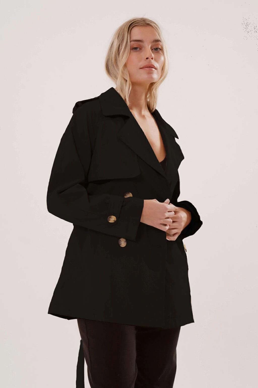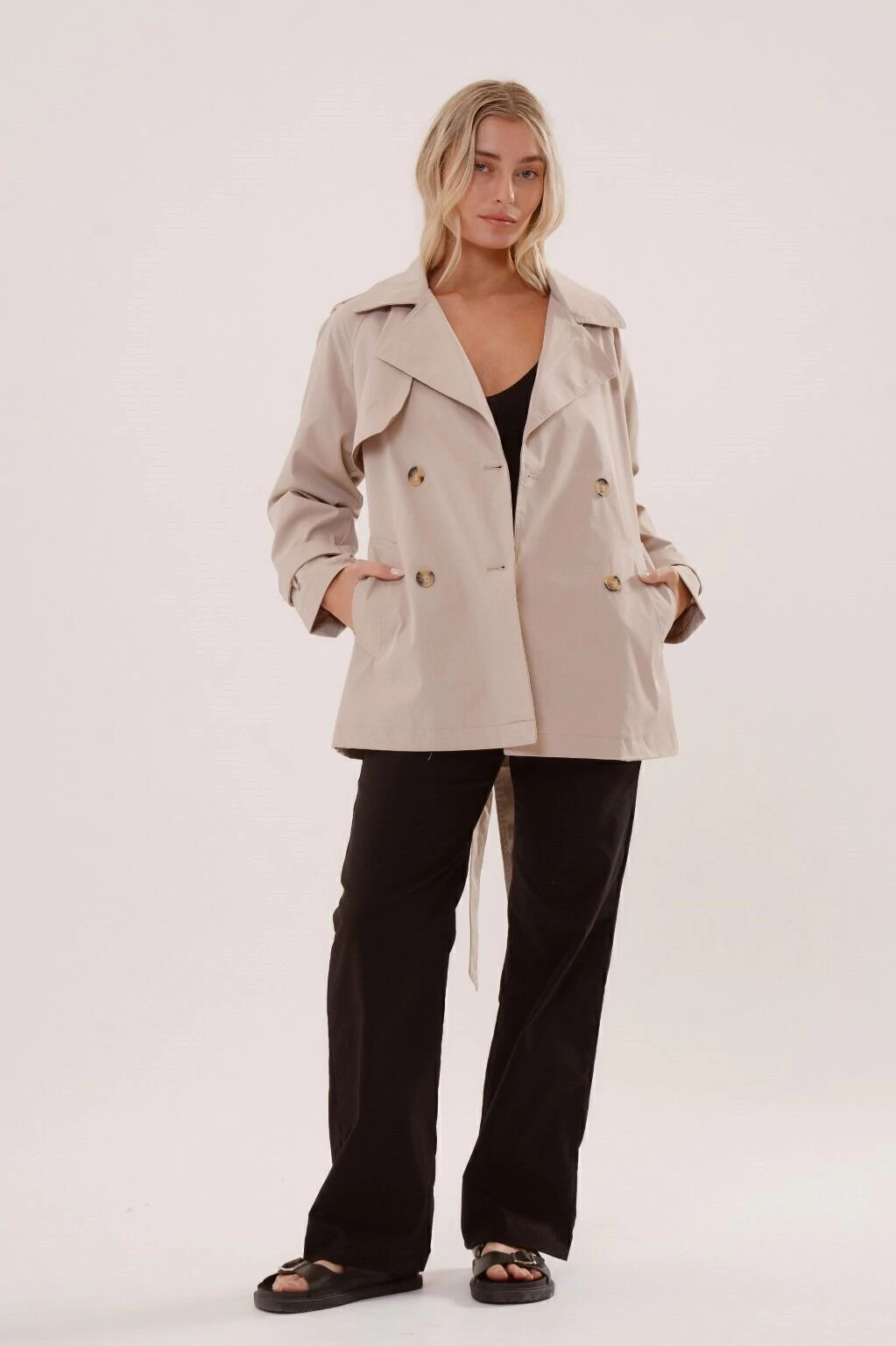 Un trench liviano, de corte sastrero y clásico. De silueta suelta,a la cadera, abotonado en el frente y con tiras de ajuste.
