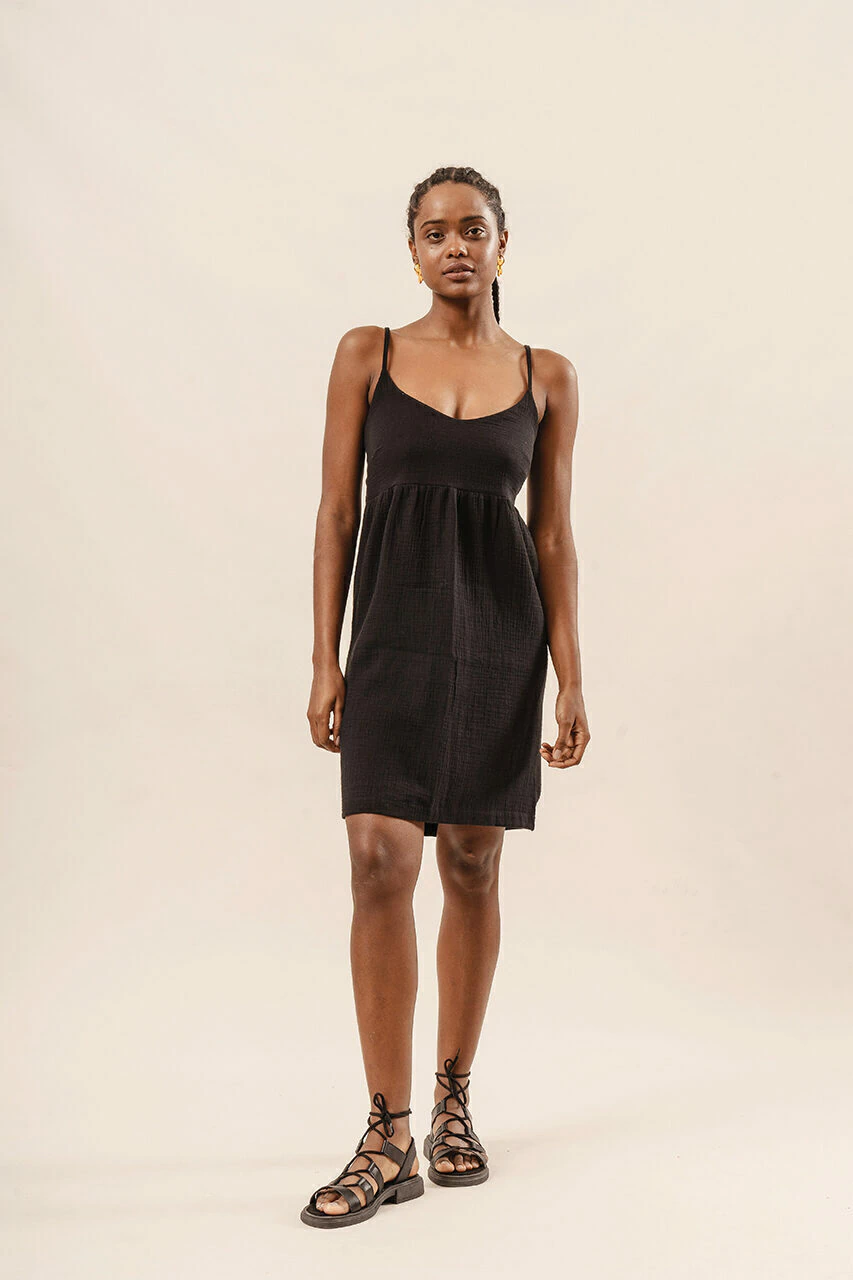 El vestido Acrópora, de silueta corta y suelta, esta confeccionado con tela de 100% algodón.