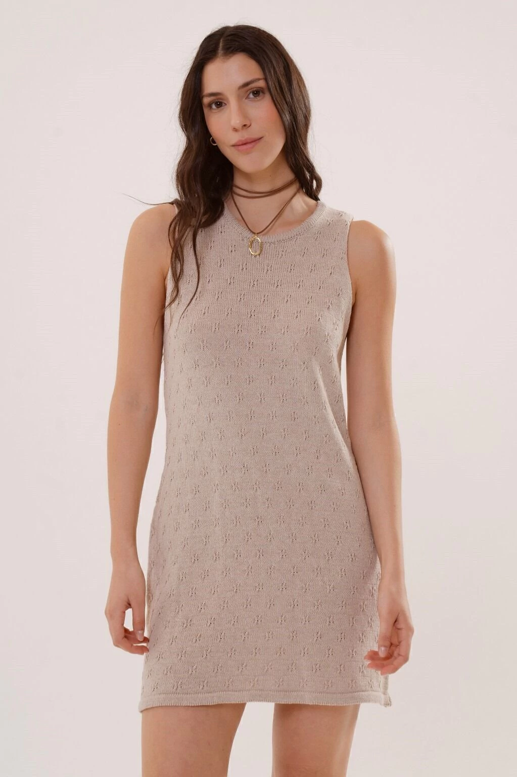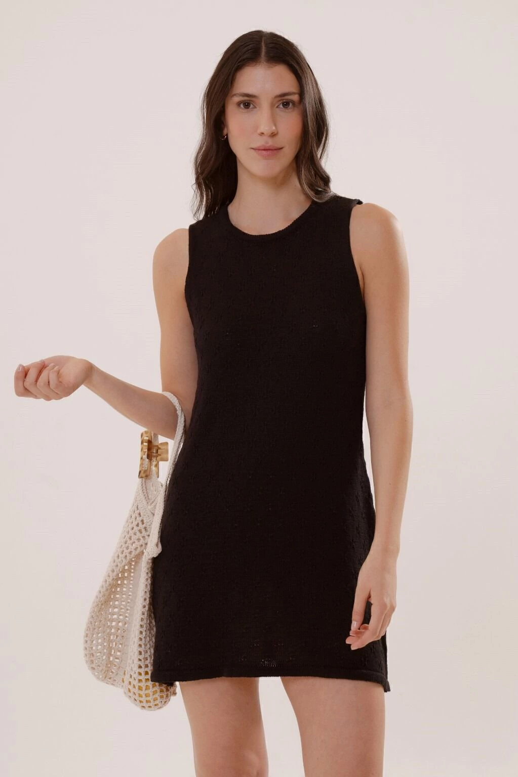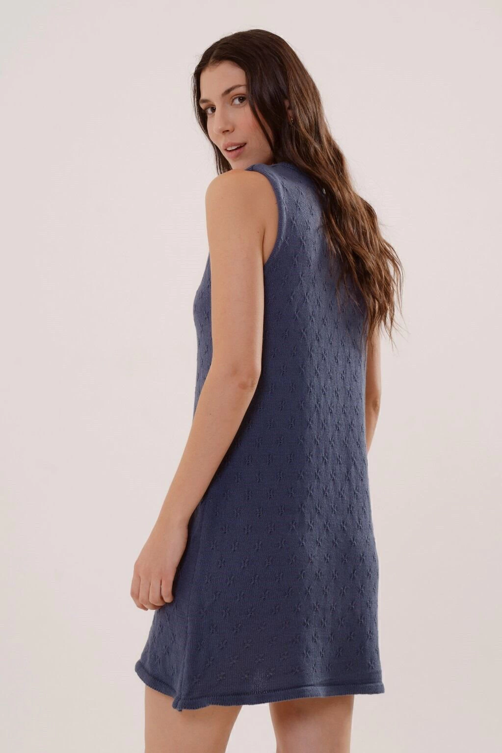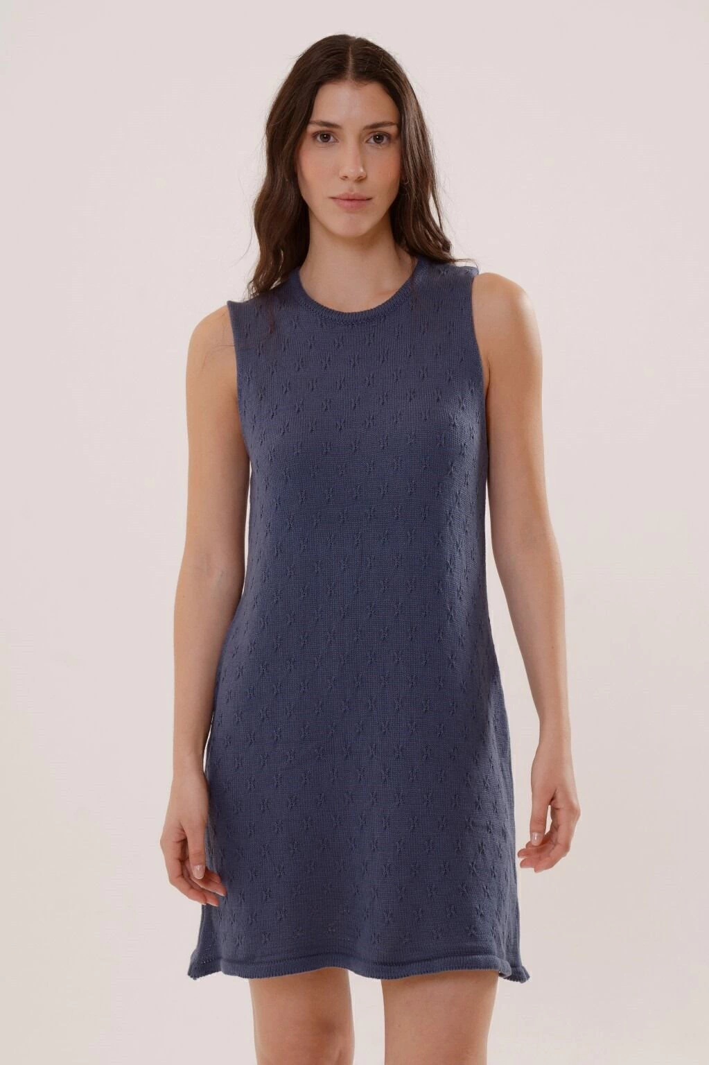 Un vestido diferente: de corte recto, suelto y confortable, tejido en punto cruzado que genera una textura unica.
