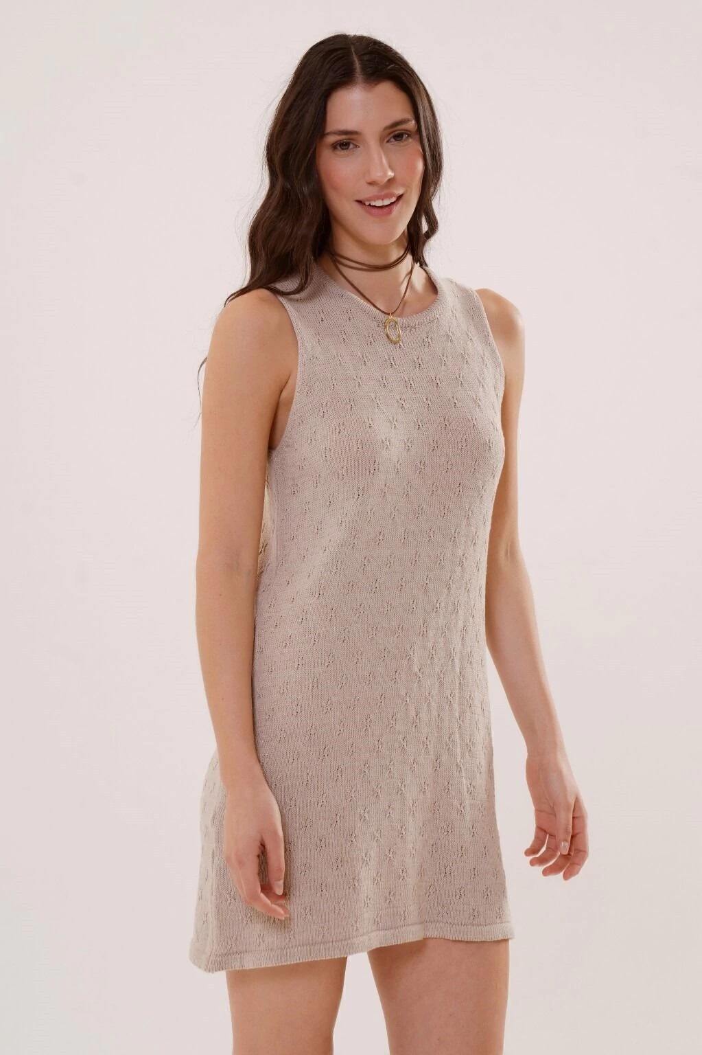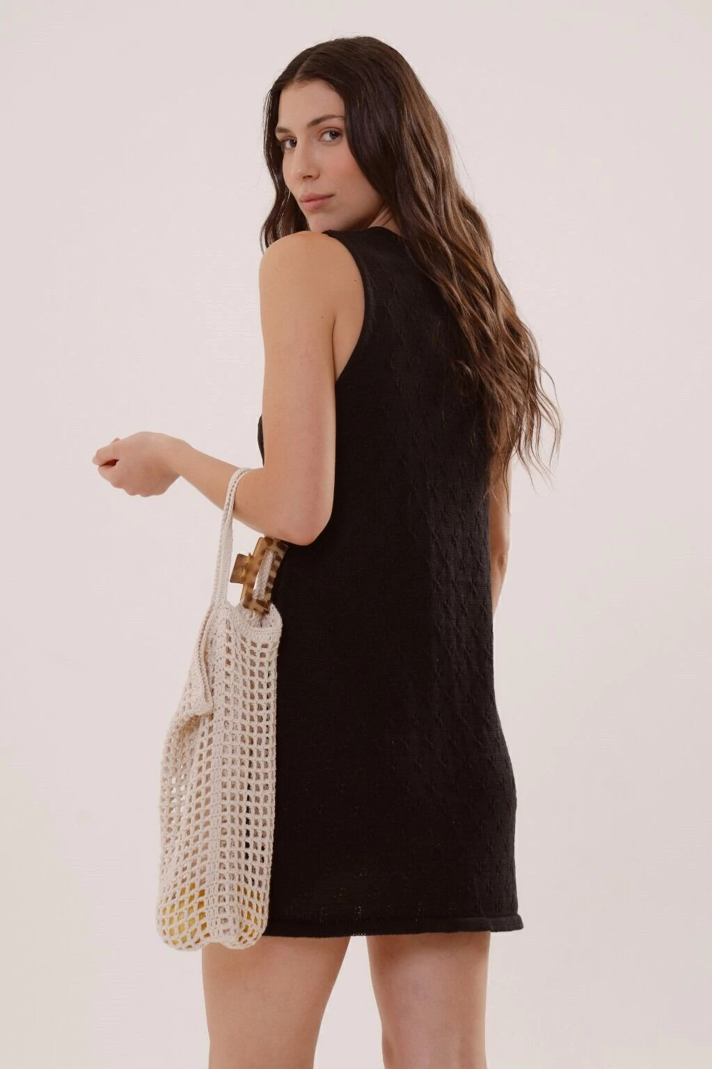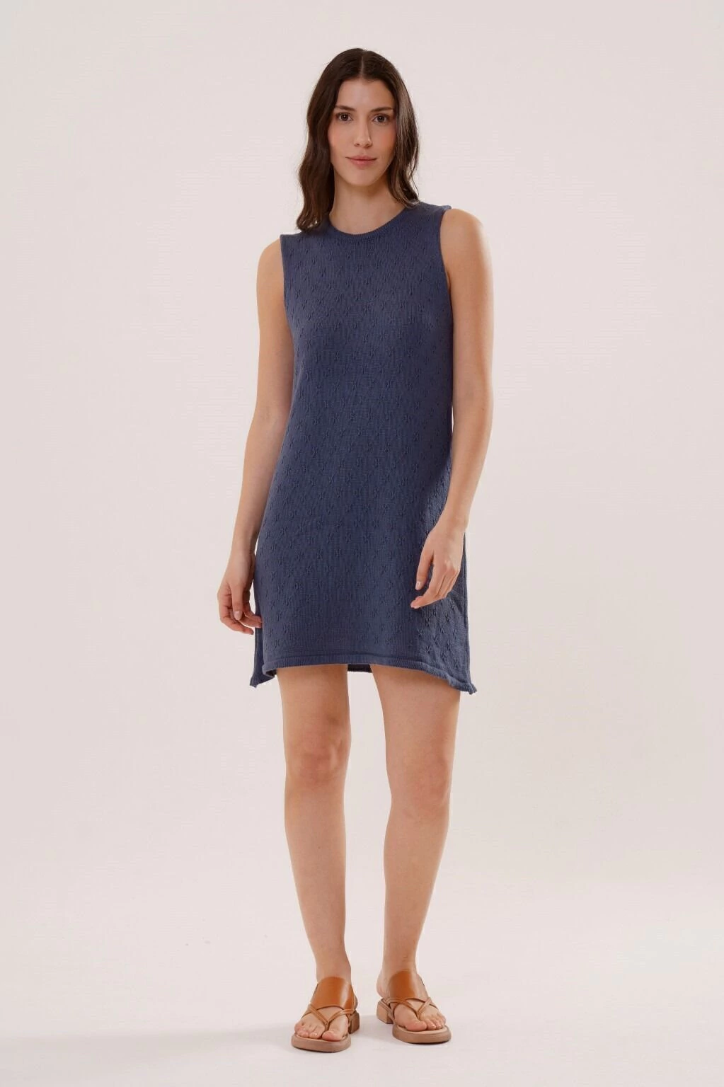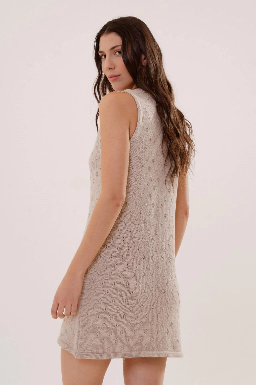 Un vestido diferente: de corte recto, suelto y confortable, tejido en punto cruzado que genera una textura unica.