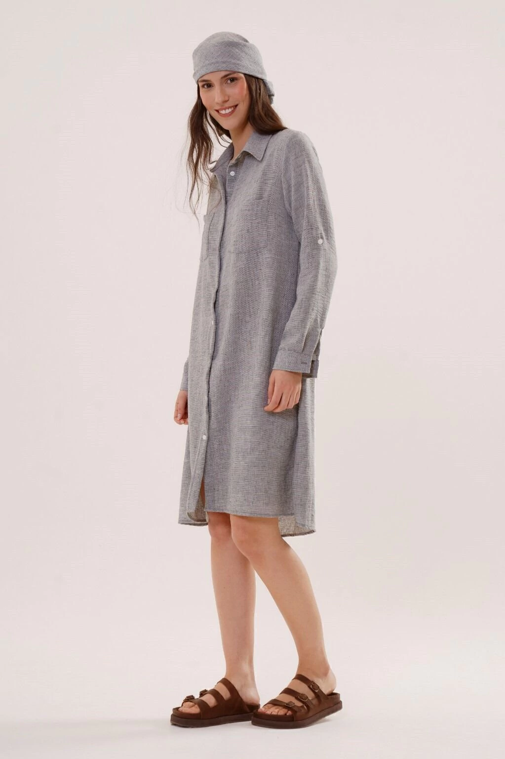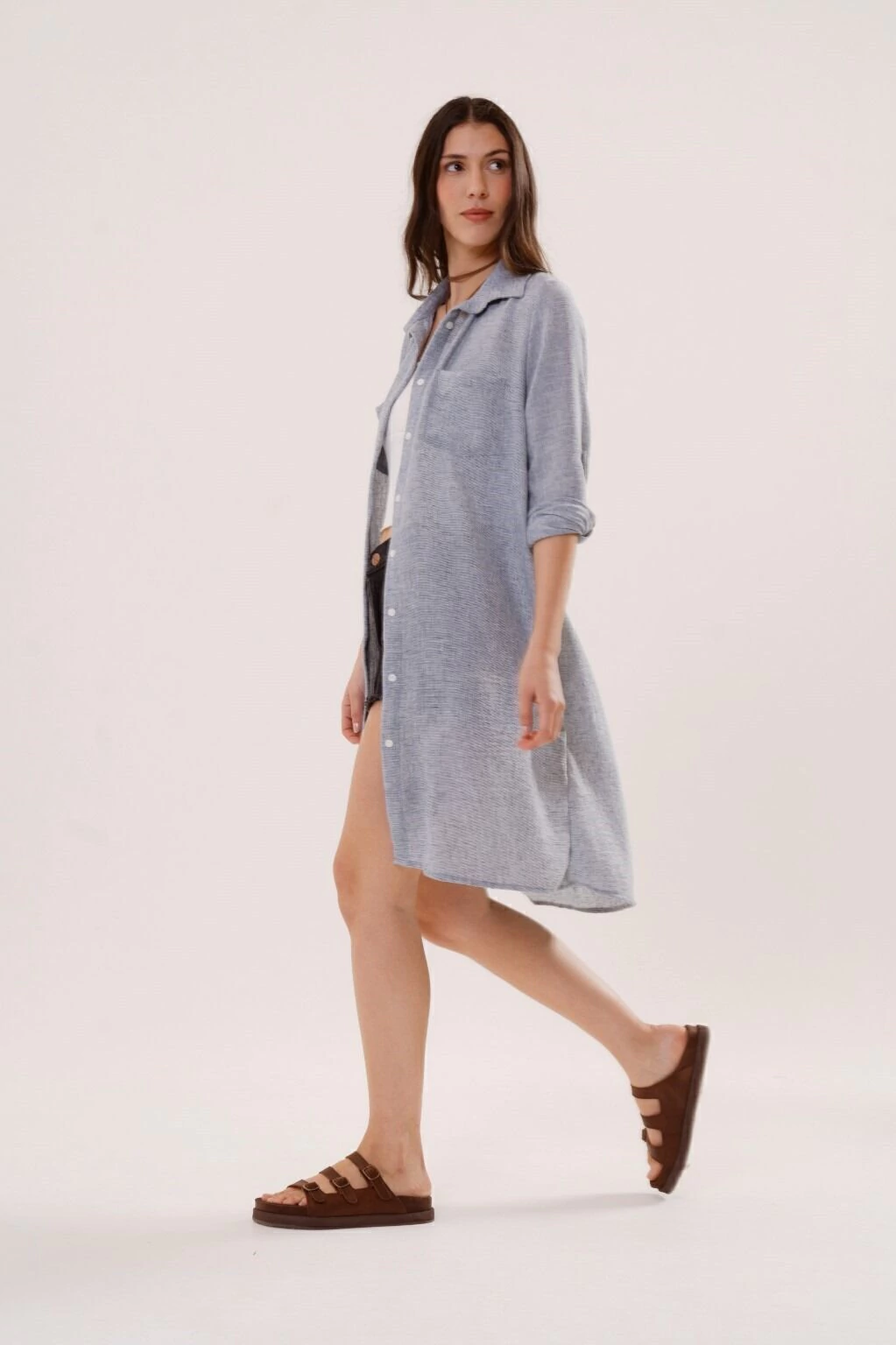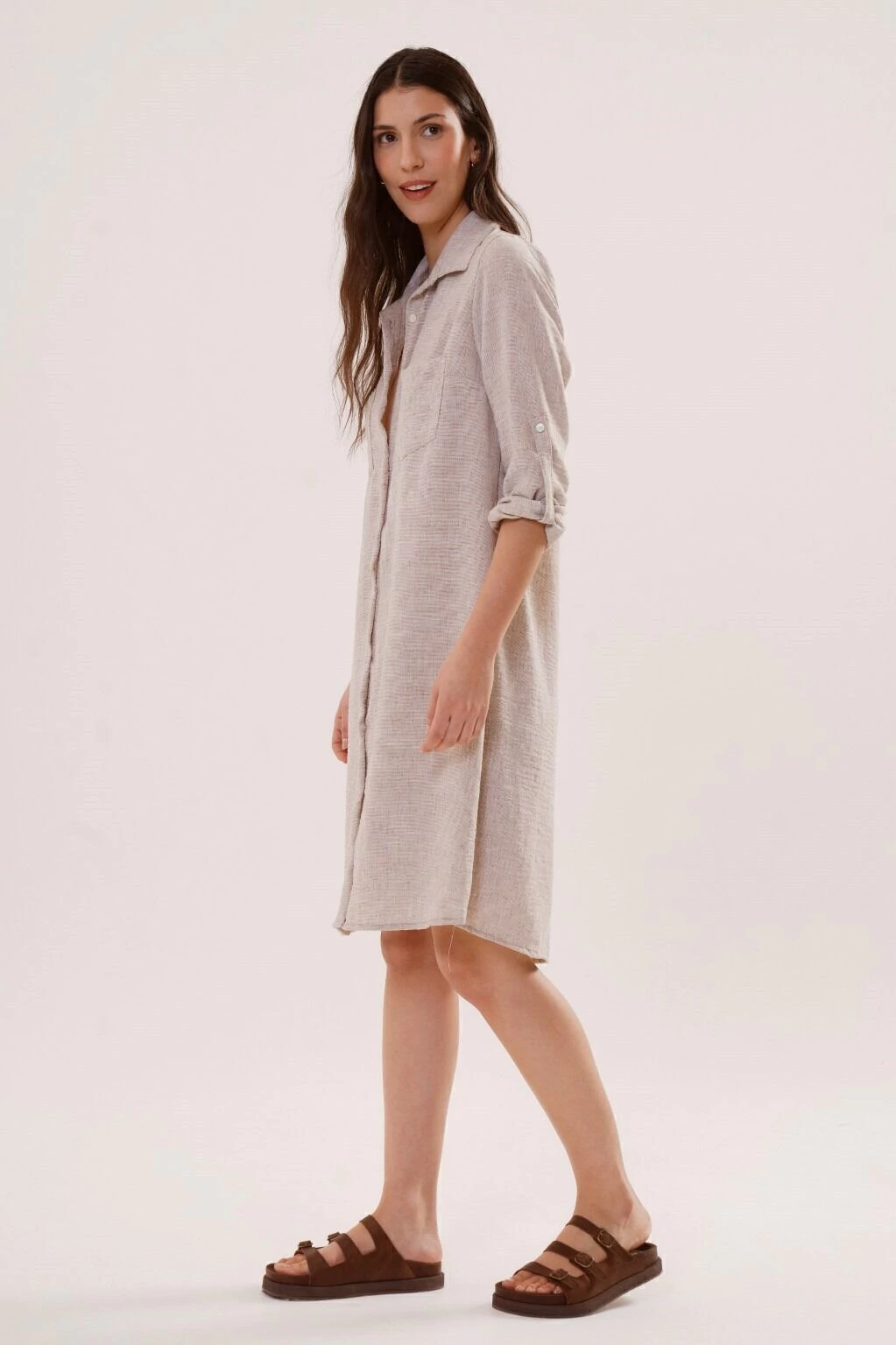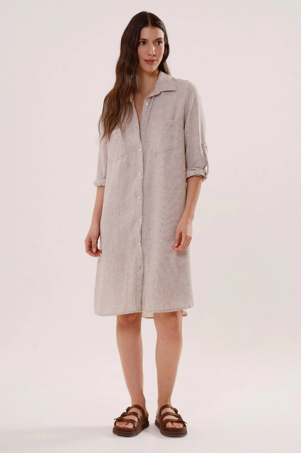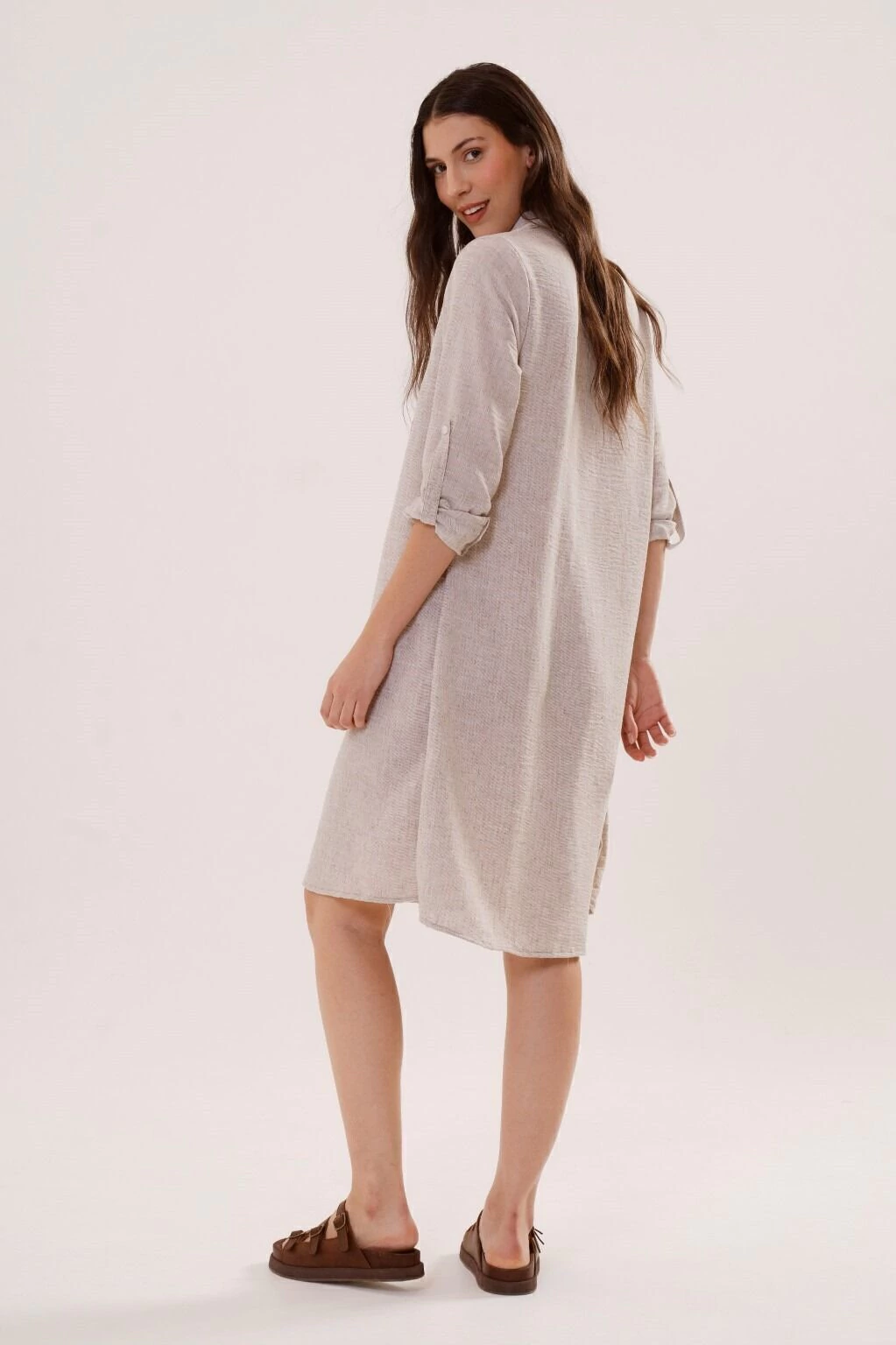 Un vestido camisero versatil, de silueta holgada, con movimiento y presencia. Contiene bolsillos en el frente, tiras charreteras en mangas para regular el largo y botones en su apertura. Confeccionado en tela lino, asegura confort y comodidad.
