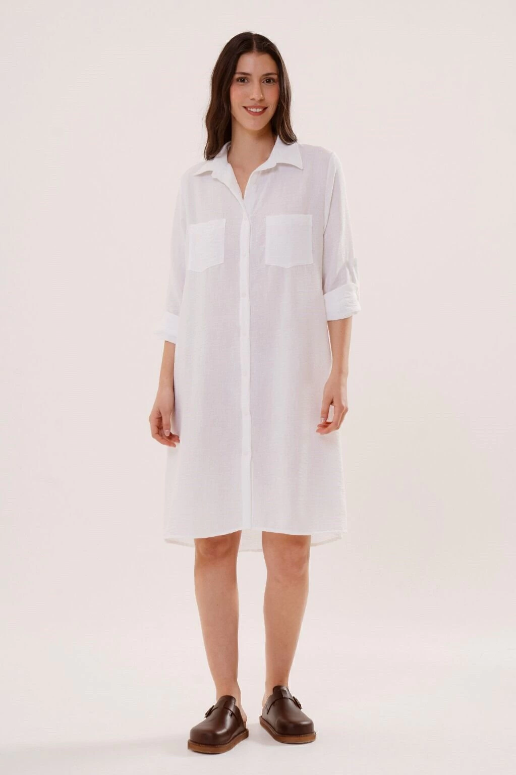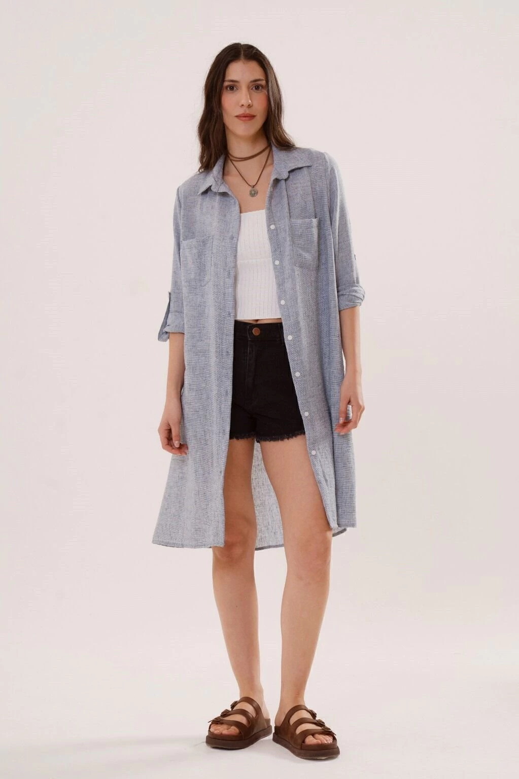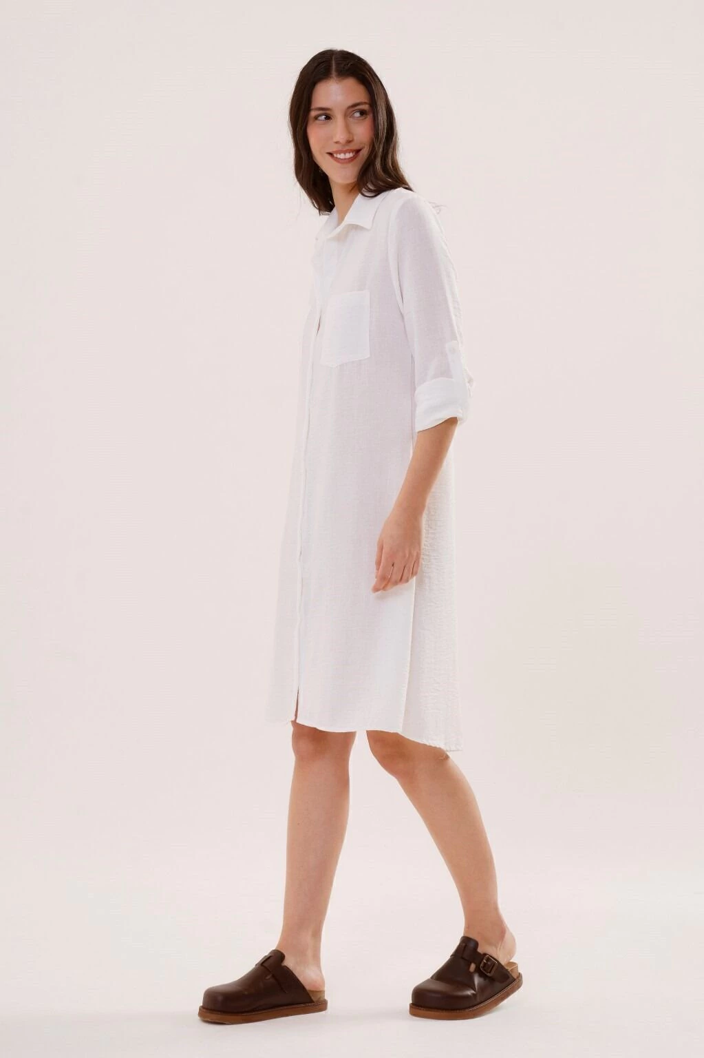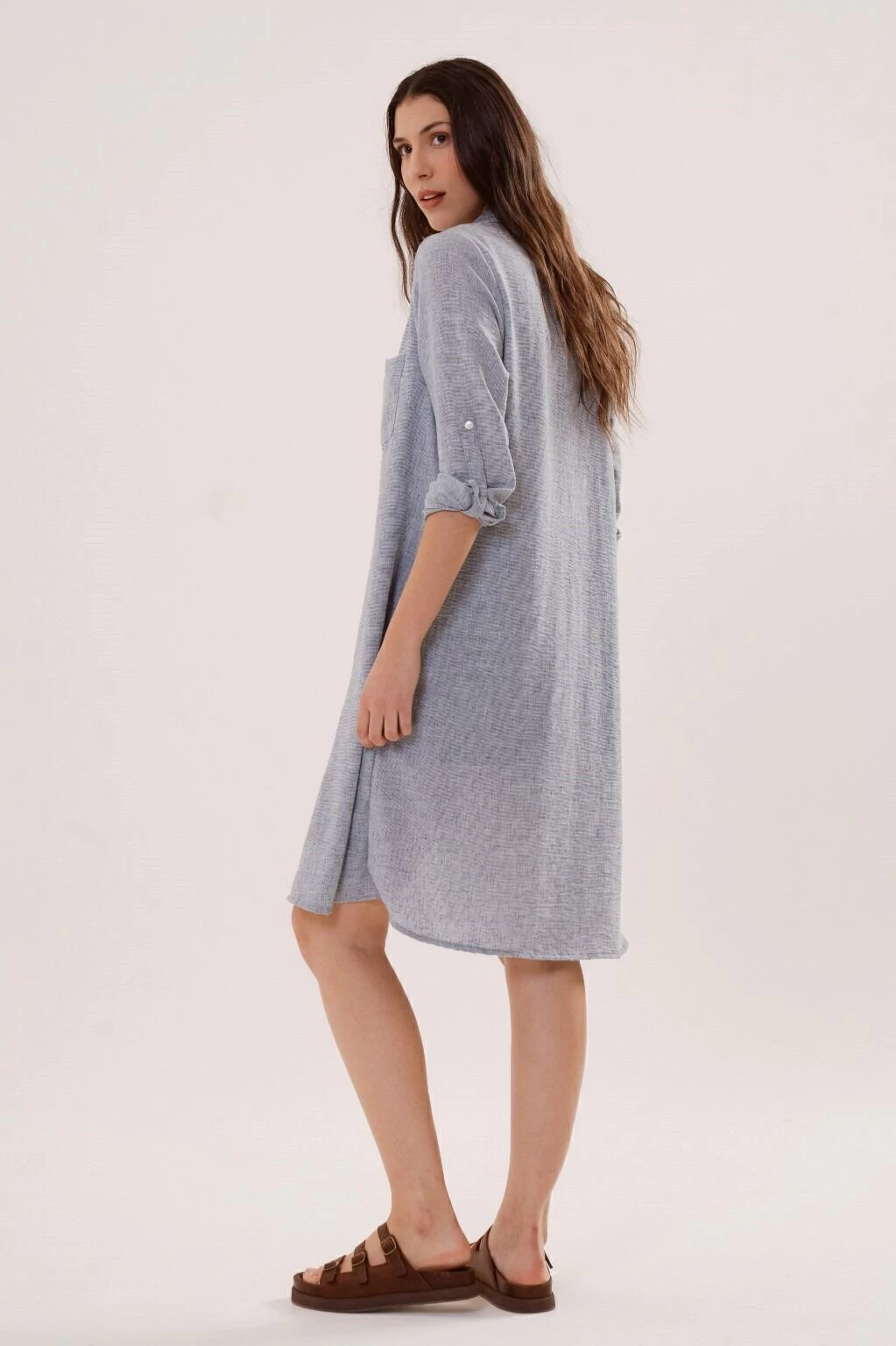 Un vestido camisero versatil, de silueta holgada, con movimiento y presencia. Contiene bolsillos en el frente, tiras charreteras en mangas para regular el largo y botones en su apertura. Confeccionado en tela lino, asegura confort y comodidad.