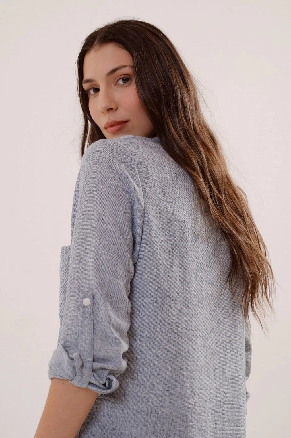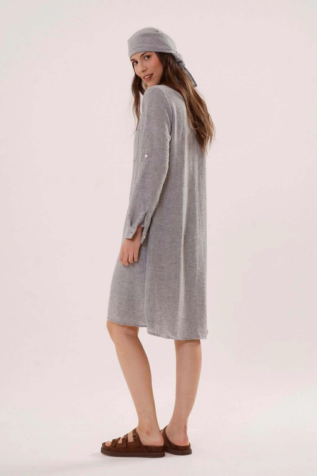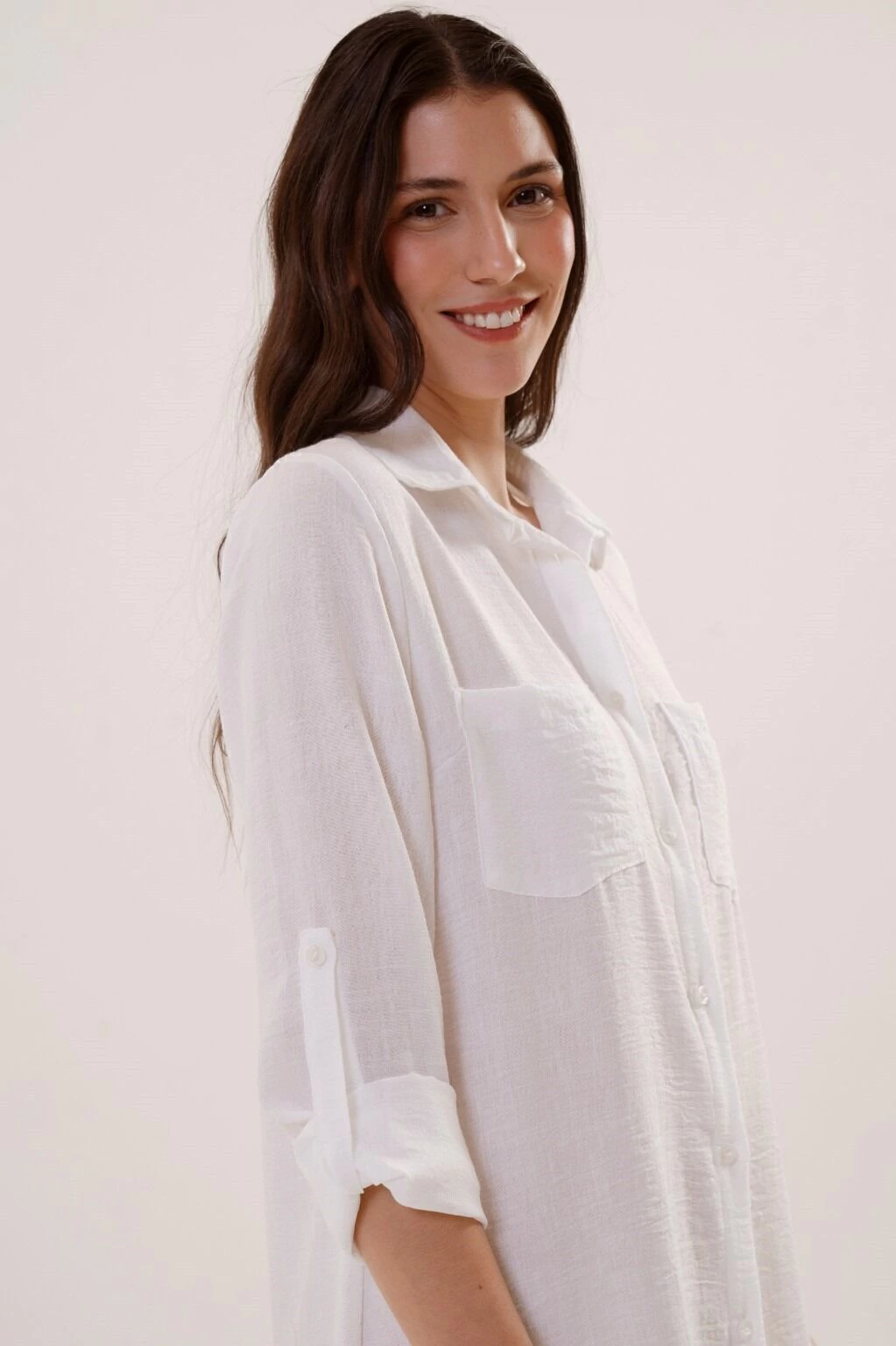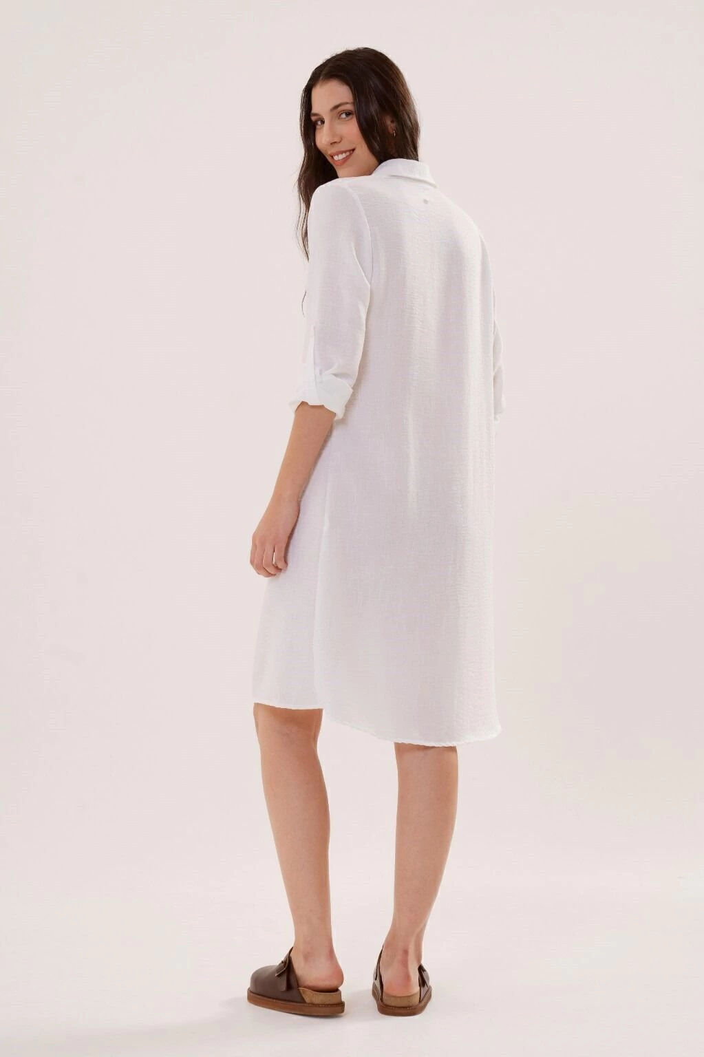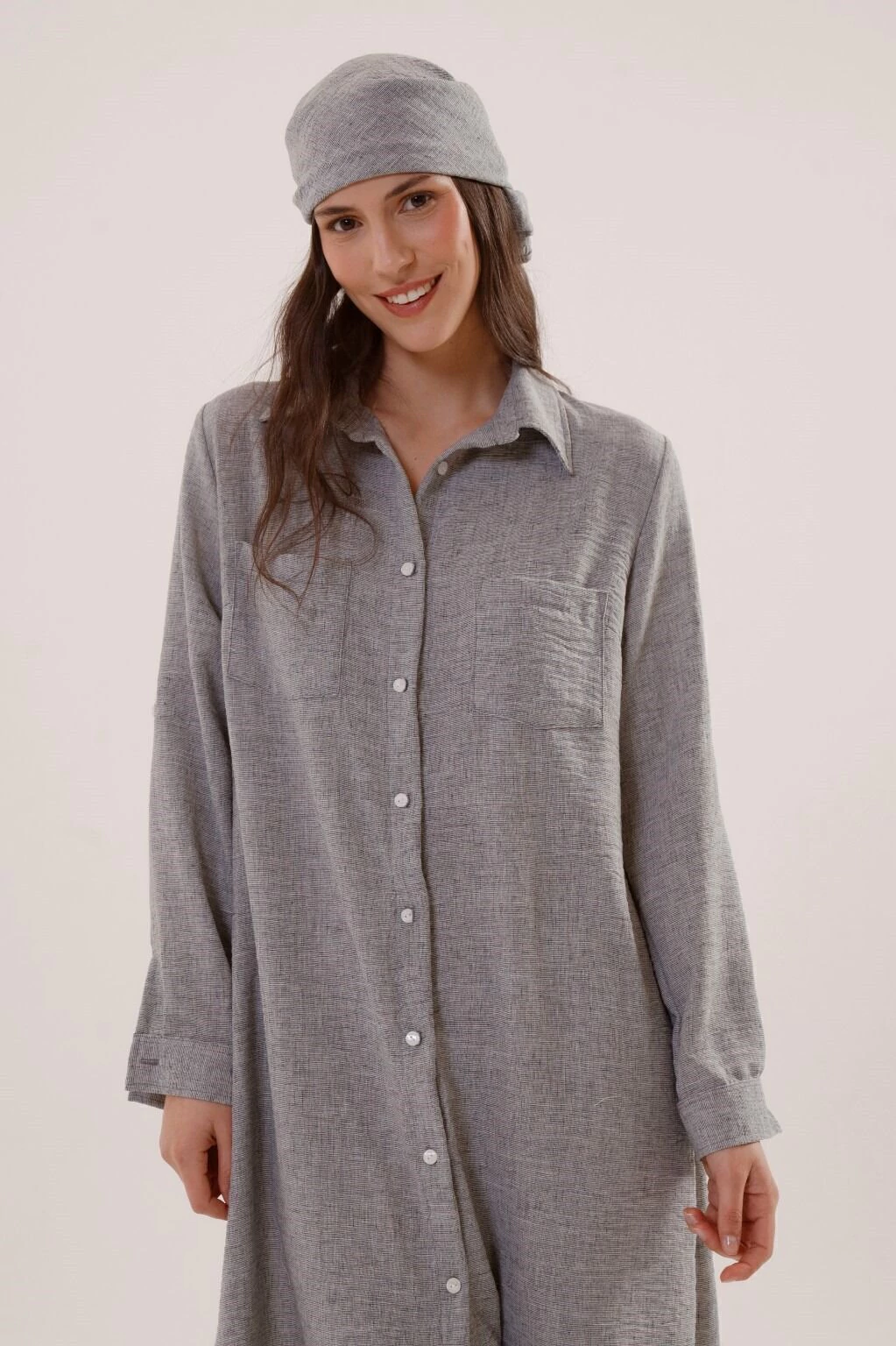 Un vestido camisero versatil, de silueta holgada, con movimiento y presencia. Contiene bolsillos en el frente, tiras charreteras en mangas para regular el largo y botones en su apertura. Confeccionado en tela lino, asegura confort y comodidad.