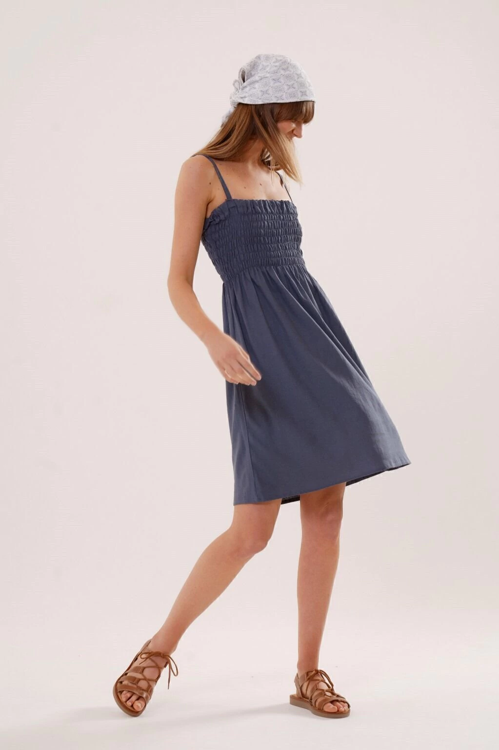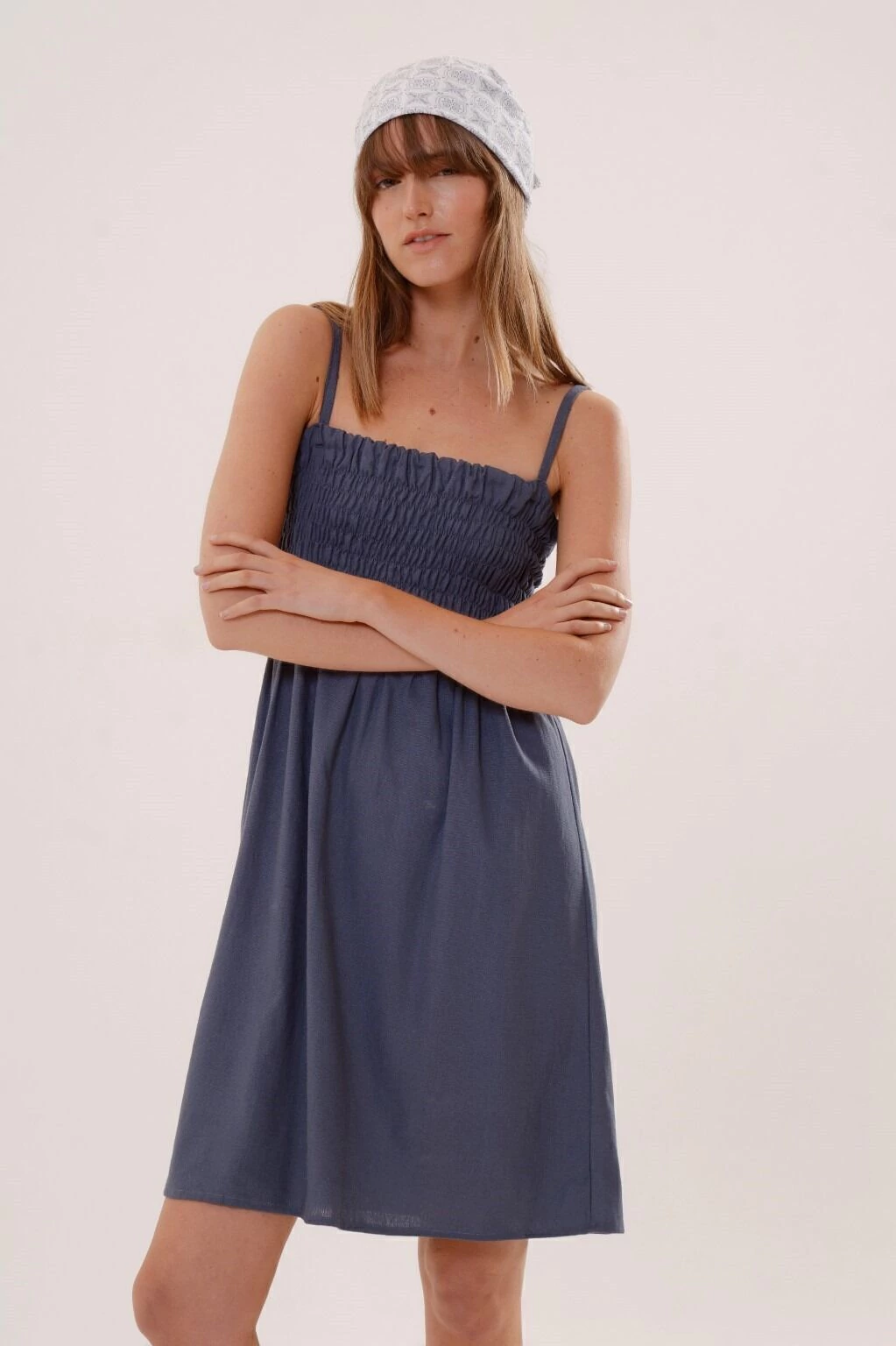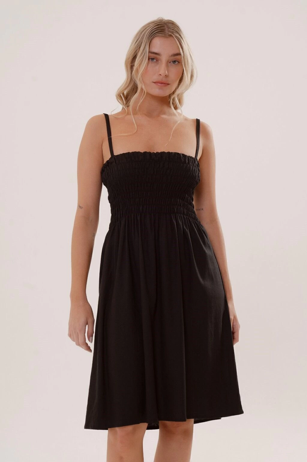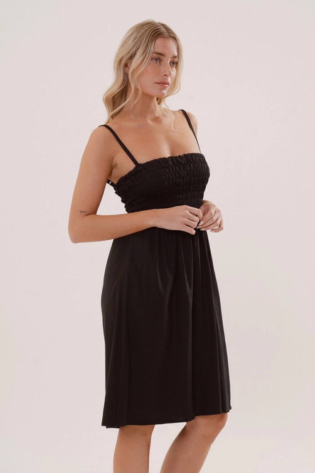 Un vestido con toque romantico: presenta frunces en busto y tiras regulables;de media campana y largo hasta la rodilla.