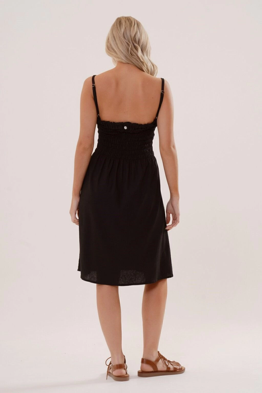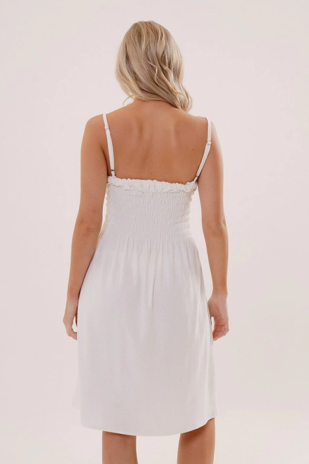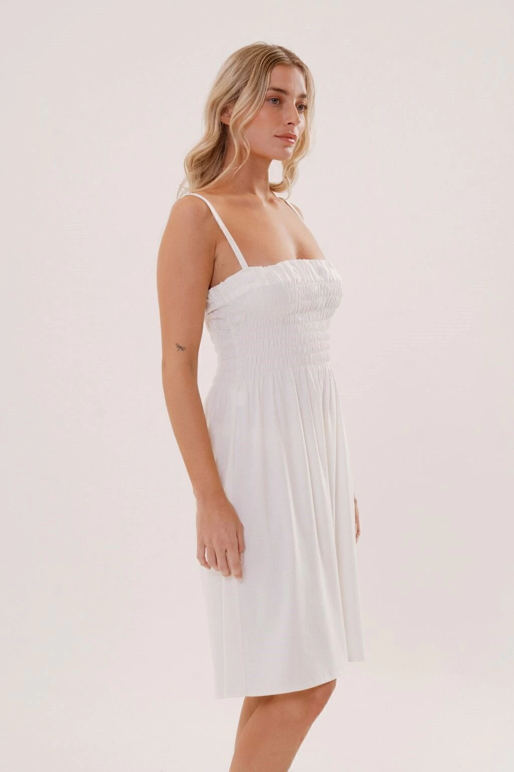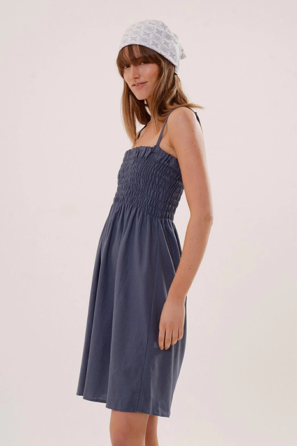 Un vestido con toque romantico: presenta frunces en busto y tiras regulables;de media campana y largo hasta la rodilla.